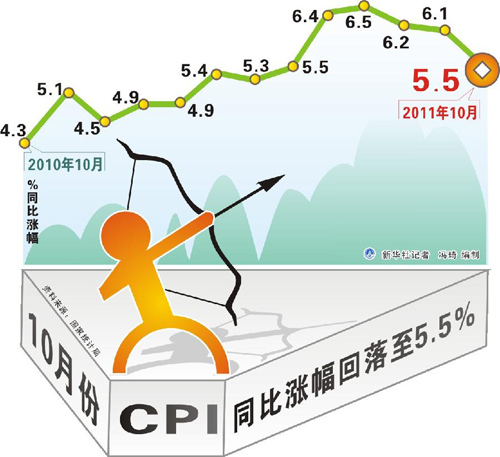 圖表:10月份CPI同比漲幅回落至5.5% 新華社記者 馮琦編制