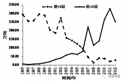 圖2  1995-2012年中國磷肥進(jìn)出口變化趨勢