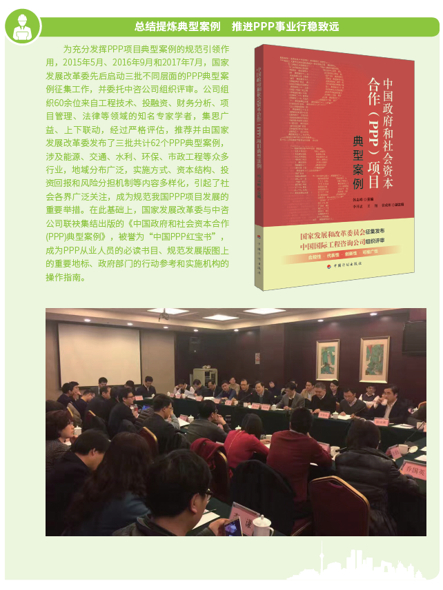 2016年以來,中咨公司緊緊圍繞“12445”發(fā)展戰(zhàn)略構想,鞏固提升五大業(yè)務支撐體系,積極探索開展政府和社會資本合作(以下簡稱PPP)咨詢等投資策劃業(yè)務,建立投融資平臺,尋找有價值的投資機會,實現(xiàn)資本與智本的融合,構建智力服務新業(yè)態(tài),拓寬工程咨詢服務價值鏈。