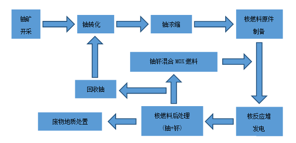 乏燃料后處理是從輻照后的乏燃料中分離提取鈾、钚等有價值的元素,回收的鈾占95%,钚占1%,其他4%主要是高放廢物。后處理生產(chǎn)的鈾經(jīng)過不同工藝處理后可用于所有堆型作為核燃料,但現(xiàn)階段均存在不同程度的技術(shù)難度,后處理生產(chǎn)的钚產(chǎn)品直接制成鈾钚混合氧化物(MOX)燃料,可用于壓水堆或快堆作為核燃料。