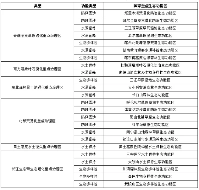與25個(gè)國(guó)家重點(diǎn)生態(tài)功能區(qū)分布對(duì)照,其中青藏高原草原退化重點(diǎn)治理區(qū)涉及7個(gè)國(guó)家重點(diǎn)生態(tài)功能區(qū),南方喀斯特石漠化重點(diǎn)治理區(qū)涉及2個(gè)國(guó)家重點(diǎn)生態(tài)功能區(qū),東北森林黑土地退化重點(diǎn)治理區(qū)涉及3個(gè)國(guó)家重點(diǎn)生態(tài)功能區(qū),北部荒漠化重點(diǎn)治理區(qū)涉及6個(gè)國(guó)家重點(diǎn)生態(tài)功能區(qū),黃土高原水土流失重點(diǎn)治理區(qū)涉及1個(gè)國(guó)家重點(diǎn)生態(tài)功能區(qū),長(zhǎng)江生態(tài)帶生態(tài)退化重點(diǎn)治理區(qū)涉及5個(gè)國(guó)家重點(diǎn)生態(tài)功能區(qū),具體分布如表1所示。