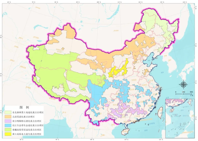 依據(jù)自然地理?xiàng)l件和集中連片打殲滅戰(zhàn)的原則,將全國(guó)生態(tài)退化地區(qū)劃分為6個(gè)生態(tài)退化重點(diǎn)治理區(qū),分別是青藏高原草原退化重點(diǎn)治理區(qū)、南方喀斯特石漠化重點(diǎn)治理區(qū)、東北森林黑土地退化重點(diǎn)治理區(qū)、北部荒漠化重點(diǎn)治理區(qū)、黃土高原水土流失重點(diǎn)治理區(qū)、長(zhǎng)江生態(tài)帶生態(tài)退化重點(diǎn)治理區(qū)。