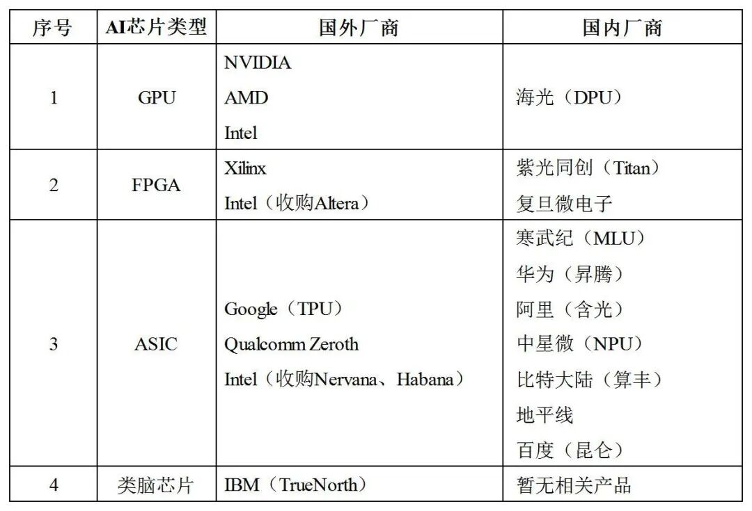 2.AI芯片特征對(duì)照及國(guó)內(nèi)外主要研制廠商