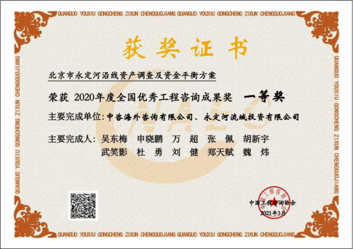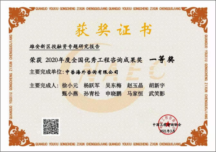 近日,在中國工程咨詢協會公布的“2020年度全國優(yōu)秀工程咨詢成果獎獲獎項目名單”中,中咨海外公司“雄安新區(qū)投融資專題研究報告”“北京市永定河沿線資產調查及資金平衡方案”兩個咨詢成果分別榮獲全國優(yōu)秀工程咨詢成果一等獎!這是公司智庫建設成果的重大突破,是公司服務國家、履行職責擔當的重要體現!