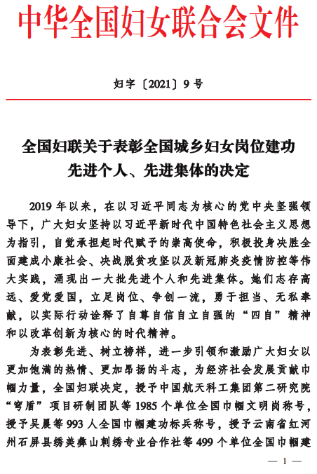 近日,全國婦聯(lián)表彰了一批先進集體和先進個人,