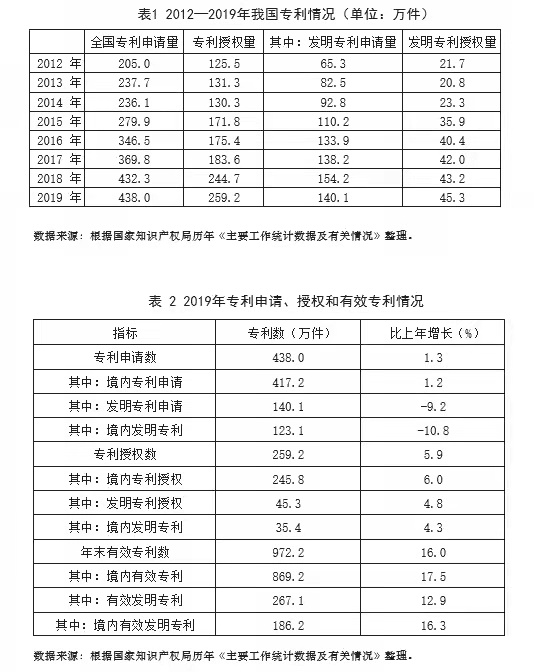 從科研成果看,2012—2019 年,我國專利申請量從 205.1 萬件增加至 438 萬件,專利授權(quán)量從 123.5 萬 件 增 加 至 259.2 萬件, 年均增長率分別達(dá)到 11.4% 和 10.9%。其中,發(fā)明專利的申請量和授權(quán)量年均增長率分別達(dá)到11.5% 和11.1%(見表 1)。截至2019 年底,我國共擁有有效專利972.2 萬件,年度環(huán)比增長16%。其中,境內(nèi)有效專利 869.2 萬件,增長17.5% ;境內(nèi)有效發(fā)明專利186.2 萬件,增長16.3%(見表 2)。目前,我國發(fā)明專利申請量和授權(quán)量、PCT 國際專利申請量均居世界首位,科技論文和自然科學(xué)指數(shù)排名僅次于美國。世界知識(shí)產(chǎn)權(quán)組織發(fā)布的“全球創(chuàng)新指數(shù)”顯示, 我國創(chuàng)新排名從2015 年的第29位躍居到2020年的第14位。目前,我國科技進(jìn)步對經(jīng)濟(jì)增長的貢獻(xiàn)率已經(jīng)達(dá)到60%,科技創(chuàng)新已成為經(jīng)濟(jì)發(fā)展的主要推動(dòng)力。