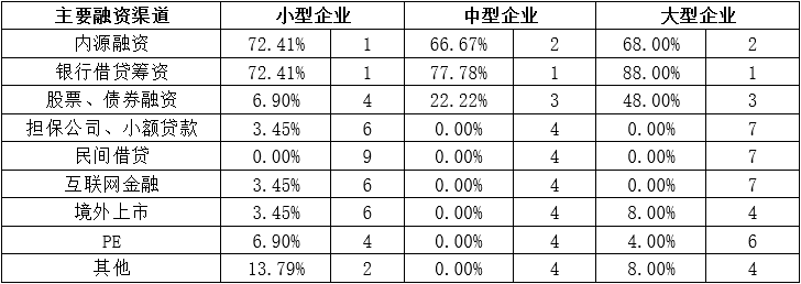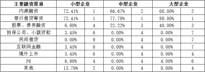 表4 不同規(guī)模企業(yè)的主要融資渠道偏好及排序表