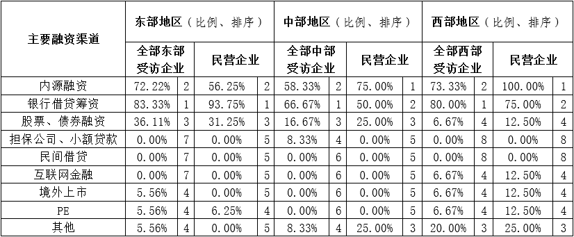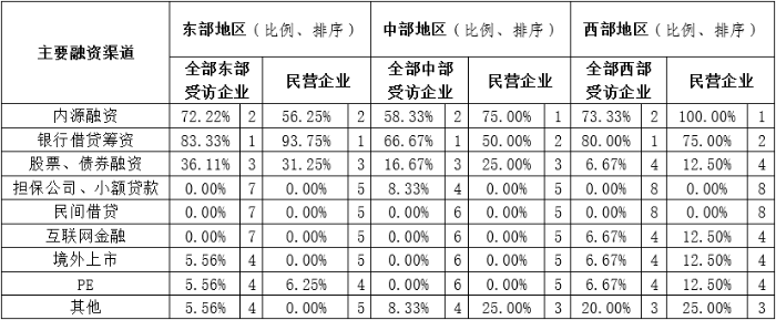 表2 不同地域企業(yè)主要融資渠道偏好情況表