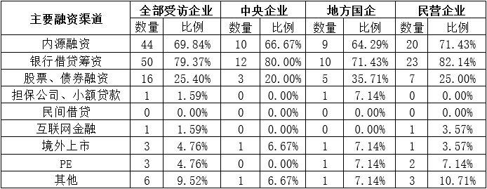 中央企業(yè)融資偏好與整體平均水平相似,其對內(nèi)源融資,股票、債券融資的依賴程度相比于整體平均水平較低;地方國企融資對銀行信貸、內(nèi)源融資的偏好比例更低,而在股票、債券融資的傾向性相對較強(qiáng)(接近36%);對于民營企業(yè)而言,銀行信貸和內(nèi)源融資仍然是主流。由于發(fā)行股票、債券條件苛刻,手續(xù)復(fù)雜且成本較高,還有可能造成股權(quán)稀釋或資產(chǎn)負(fù)債率過高的問題,民營企業(yè)傾向于采用這種融資渠道的比例較低。