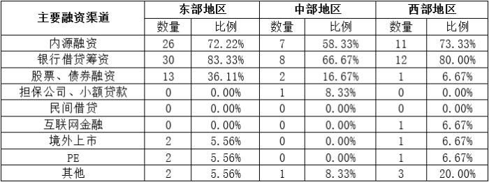 綜合比較不同地區(qū)企業(yè)融資情況可以發(fā)現(xiàn),一方面,東部地區(qū)企業(yè)傾向采用股票、債券融資方式的比例最高,其次是中部地區(qū),最后是西部地區(qū)。這從某種程度上反映了三個(gè)地區(qū)中企業(yè)采取股票、債券融資方式的難易程度,與各地區(qū)經(jīng)濟(jì)發(fā)展程度也高度契合;另一方面,東部地區(qū)與中部地區(qū)企業(yè)更專注于傳統(tǒng)的銀行信貸,內(nèi)源融資,股票、債券融資方式,相較之下,西部地區(qū)企業(yè)所涉及的融資渠道種類最多,覆蓋了互聯(lián)網(wǎng)金融、境外上市、PE和其他等新型融資方式,其可能的原因是西部地區(qū)企業(yè)因?qū)で蠊善薄谫Y的難度較大,為了獲取資金而積極探索其他融資方式。