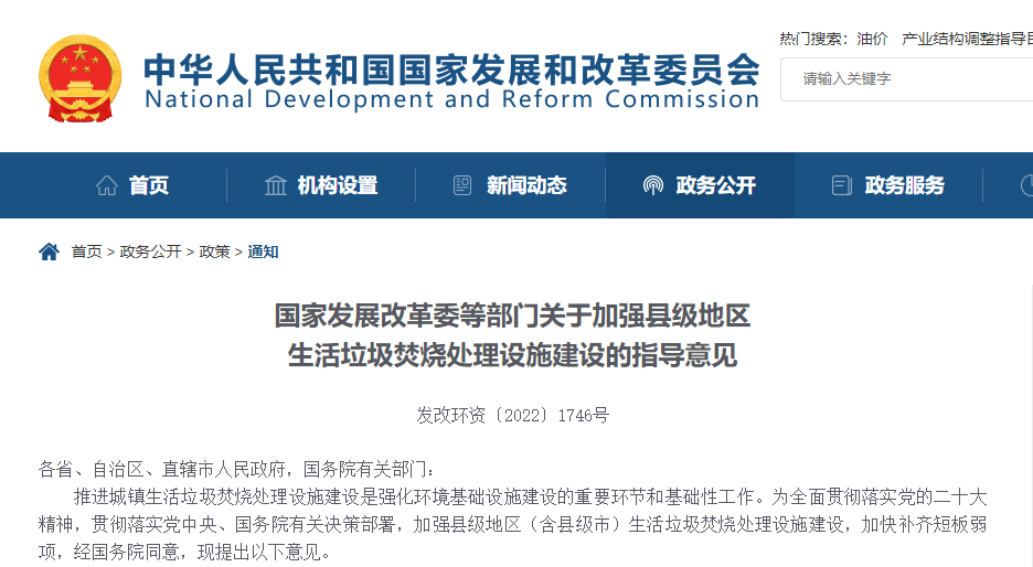 推進(jìn)城鎮(zhèn)生活垃圾焚燒處理設(shè)施建設(shè)是強(qiáng)化環(huán)境基礎(chǔ)設(shè)施建設(shè)的重要環(huán)節(jié)和基礎(chǔ)性工作,是改善人居環(huán)境的重要內(nèi)容。黨中央、國(guó)務(wù)院高度重視城鎮(zhèn)環(huán)境基礎(chǔ)設(shè)施,黨的二十大報(bào)告明確提出要“提升環(huán)境基礎(chǔ)設(shè)施建設(shè)水平”。近日,經(jīng)國(guó)務(wù)院同意,國(guó)家發(fā)展改革委、住房和城鄉(xiāng)建設(shè)部、生態(tài)環(huán)境部、財(cái)政部、人民銀行等部門聯(lián)合印發(fā)《關(guān)于加強(qiáng)縣級(jí)地區(qū)生活垃圾焚燒處理設(shè)施建設(shè)的指導(dǎo)意見》(發(fā)改環(huán)資〔2022〕1746號(hào),以下簡(jiǎn)稱《指導(dǎo)意見》),全面系統(tǒng)提出加強(qiáng)縣級(jí)地區(qū)生活垃圾焚燒處理設(shè)施建設(shè)的指導(dǎo)思想、工作原則、主要目標(biāo)、重點(diǎn)任務(wù),指導(dǎo)各地有力有序推進(jìn)焚燒處理設(shè)施建設(shè)?!吨笇?dǎo)意見》作為首個(gè)聚焦縣級(jí)地區(qū)生活垃圾處理的政策文件,是貫徹落實(shí)黨的二十大精神的重要舉措,對(duì)加快補(bǔ)齊縣級(jí)地區(qū)生活垃圾焚燒處理短板、提升生活垃圾治理水平、改善人居環(huán)境具有重要意義。