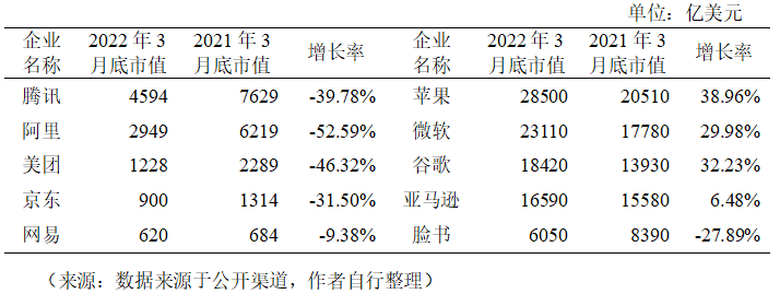 (二)頭部數(shù)字平臺企業(yè)市值下滑嚴重。截至2022年3月底,我國平臺企業(yè)中市值排名前5位的依次是騰訊、阿里、美團、京東和網(wǎng)易,其中騰訊市值4594億美元,同比下降39.78%,阿里市值2949億美元,同比下降52.59%,美團市值1228億美元,同比下降46.32%,下滑幅度均超過三分之一。美國平臺企業(yè)中市值排名前5位的依次是蘋果、微軟、谷歌、亞馬遜和臉書,其中蘋果市值28500億美元,同比上漲38.96%,微軟市值23110億美元,同比上漲29.98%,谷歌市值18420億美元,同比上漲32.23%,上漲幅度均超過四分之一。過去的一年間,中美互聯(lián)網(wǎng)平臺企業(yè)的市值差距越來越大。