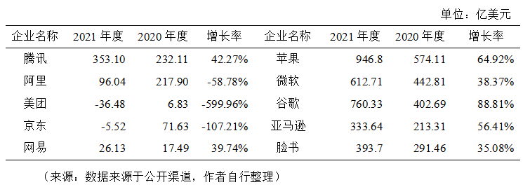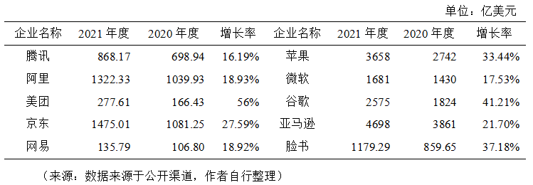 (三)頭部數(shù)字平臺企業(yè)營收整體不高。營業(yè)收入方面,2021年度我國平臺企業(yè)營收實現(xiàn)增長。其中京東營業(yè)收入1475.01億美元,同比增長27.59%,阿里營業(yè)收入1322.33億美元,同比增長18.93%,騰訊營業(yè)收入868.17億美元,同比增長16.19%;美國平臺企業(yè)中亞馬遜營業(yè)收入4698億美元,同比增長21.7%,蘋果營業(yè)收入3658億美元,同比增長33.44%,谷歌營業(yè)收入2575億美元,同比增長41.21%。我國京東、阿里的營業(yè)收入均不足亞馬遜的三分之一,且我國前5大平臺企業(yè)差距較大,美團和網(wǎng)易的營業(yè)收入僅為277.61億美元和135.79億美元,我國前5大平臺企業(yè)的平均營業(yè)收入不足美國前5大平臺企業(yè)的30%。