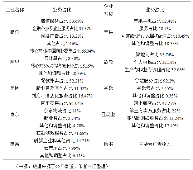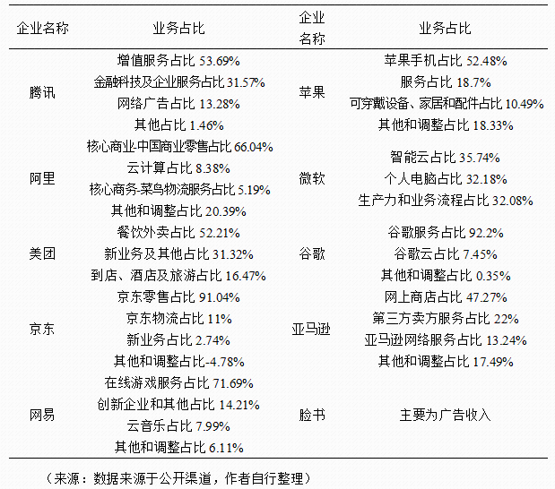 表4   中美前5大平臺企業(yè)收入結(jié)構對比