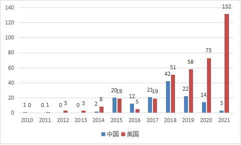 圖2  2010~2021年中美新增獨角獸企業(yè)對比