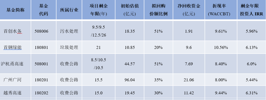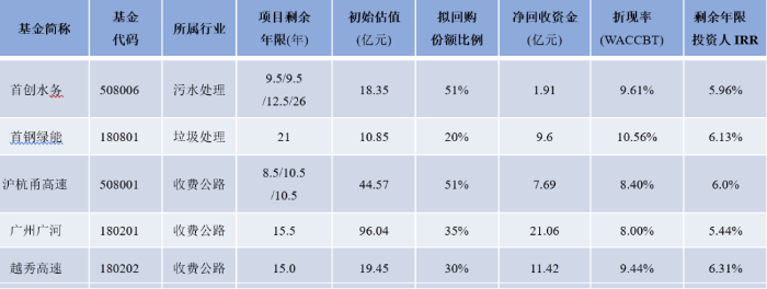 四是回購份額比例。公募REITs要求項(xiàng)目公司的全部股權(quán)必須通過資產(chǎn)證券化(ABS)轉(zhuǎn)移至公募基金,但原始權(quán)益人必須回購公募基金一定比例的份額,最低是20%,也可以繼續(xù)并表管理。這五單中,除了首鋼綠能為20%的,其他4單均超過20%,最高達(dá)到51%。