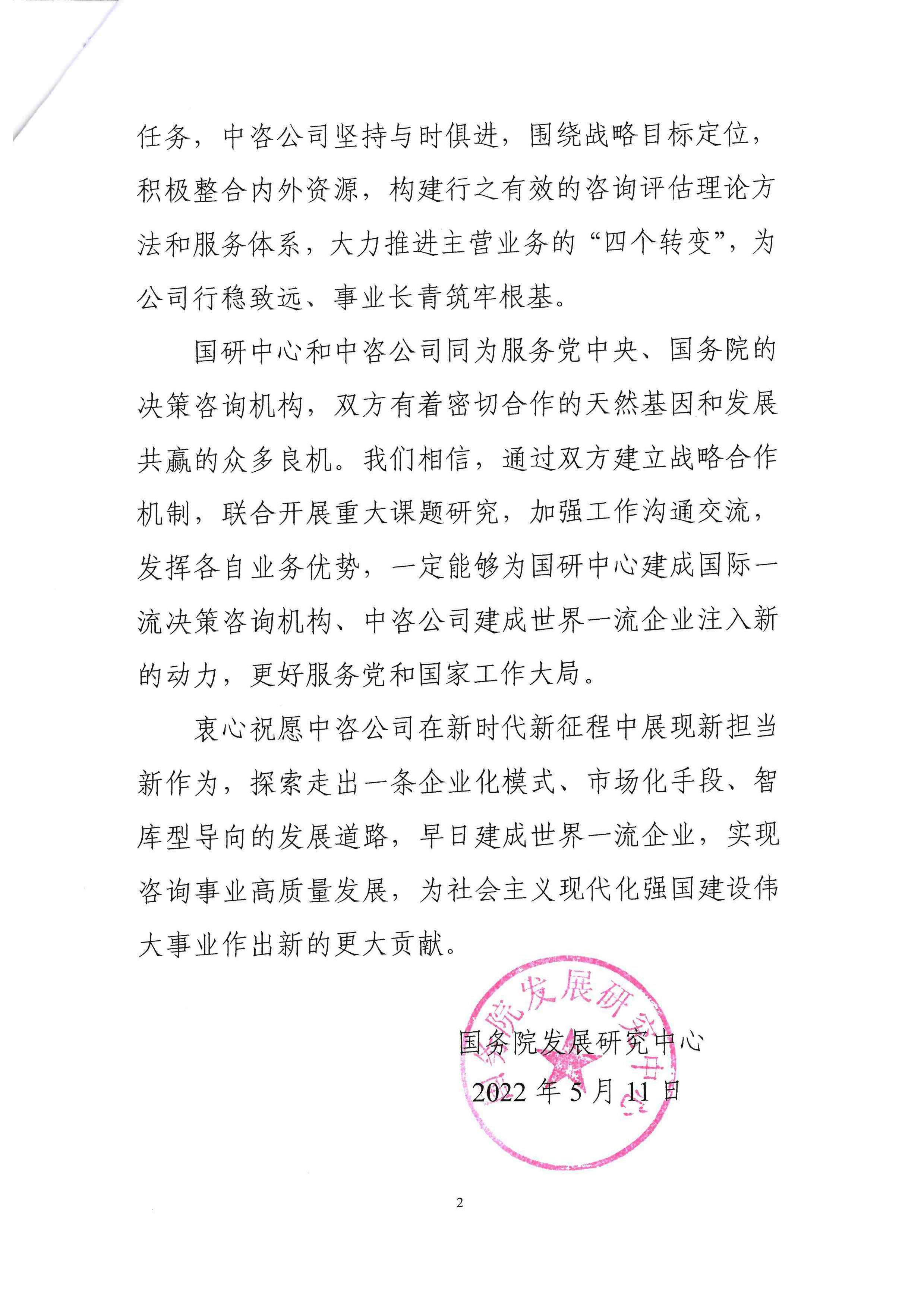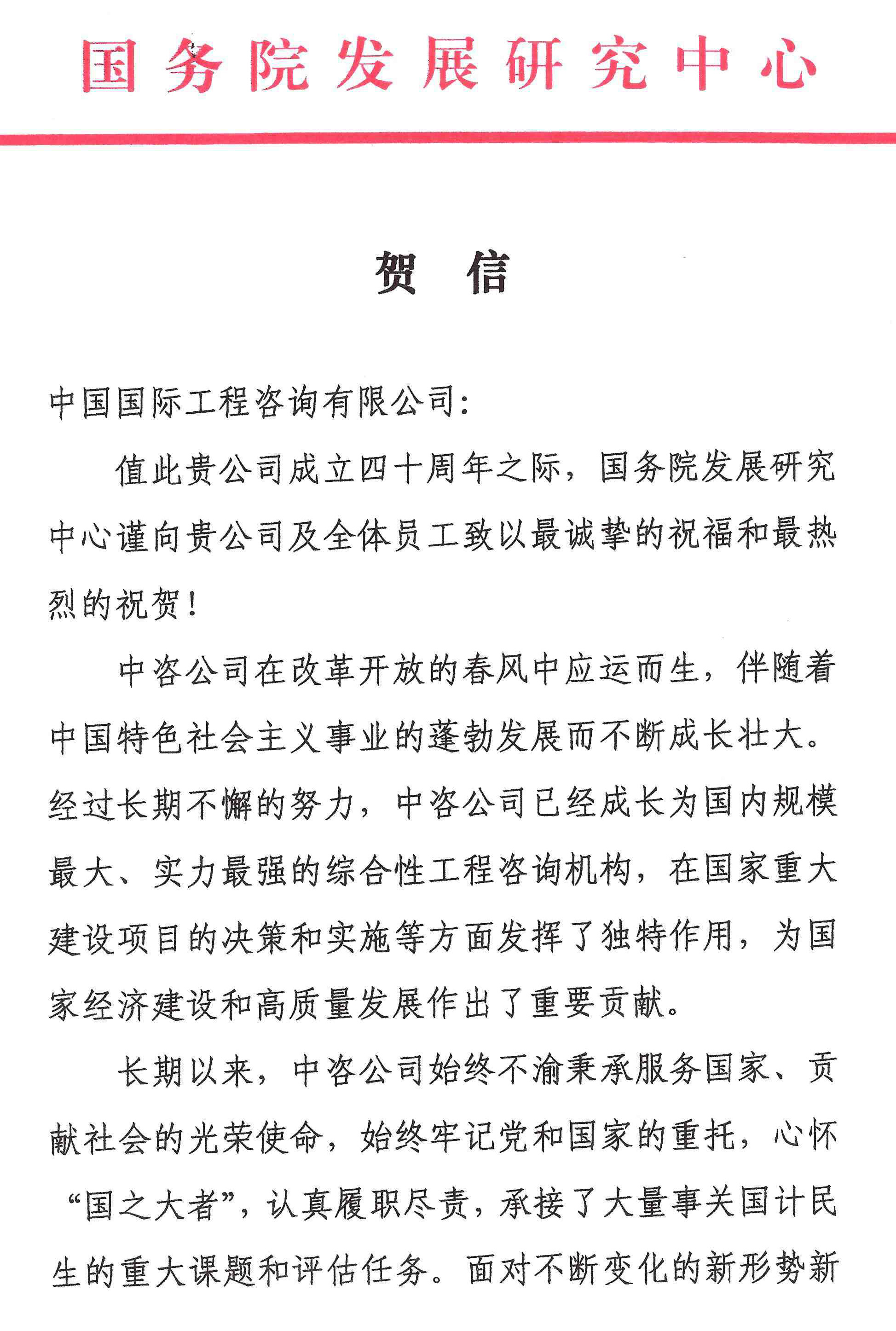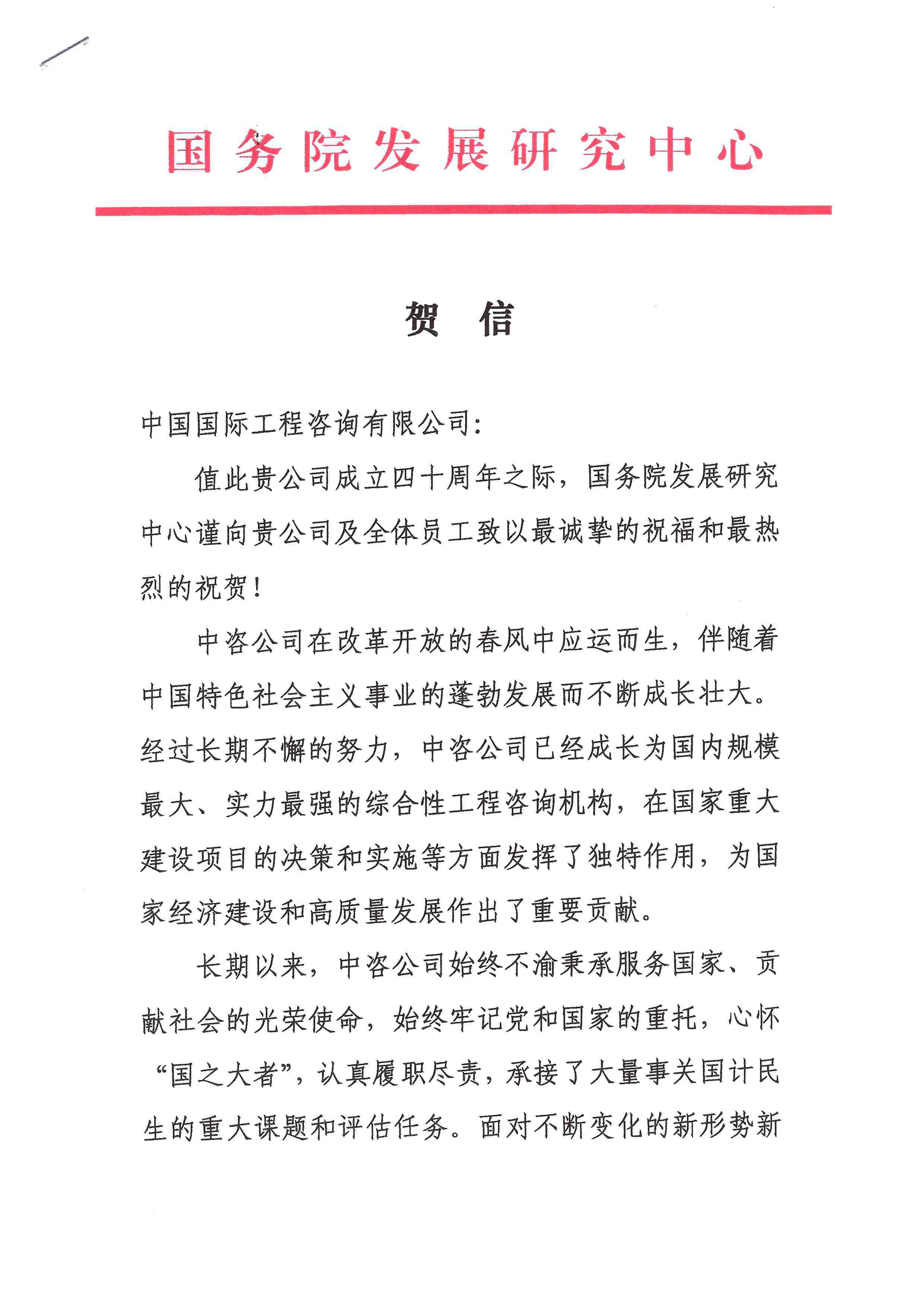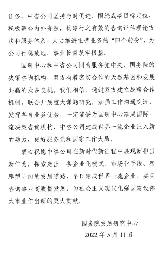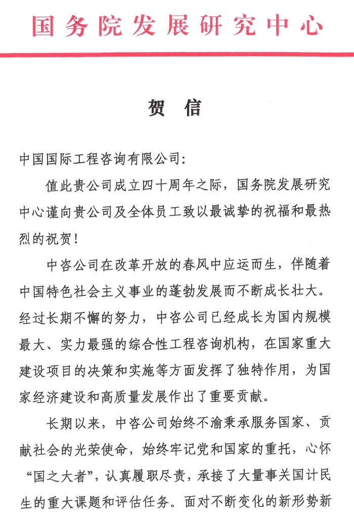 國(guó)務(wù)院發(fā)展研究中心發(fā)來賀信
