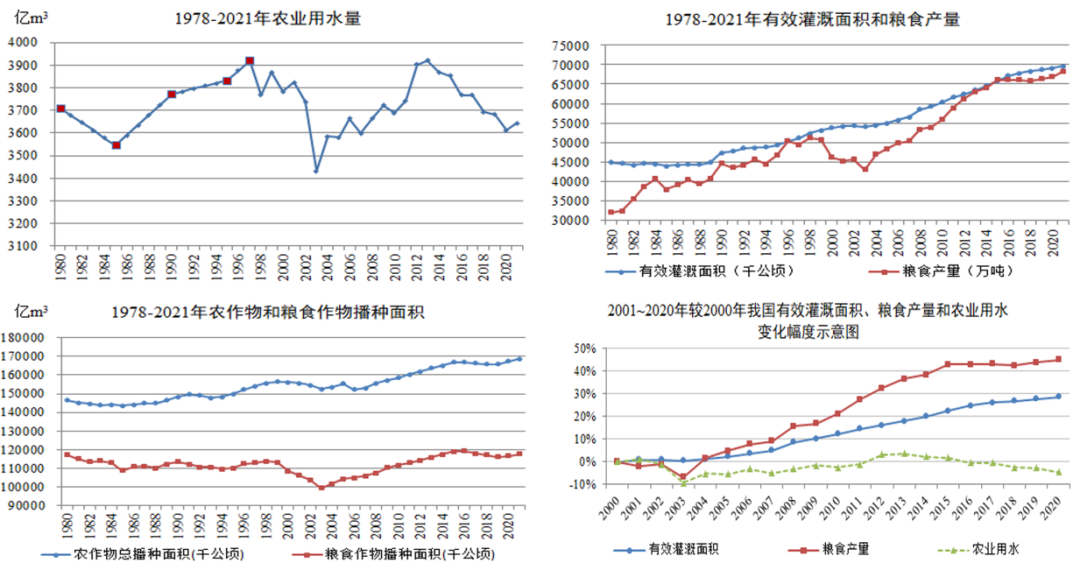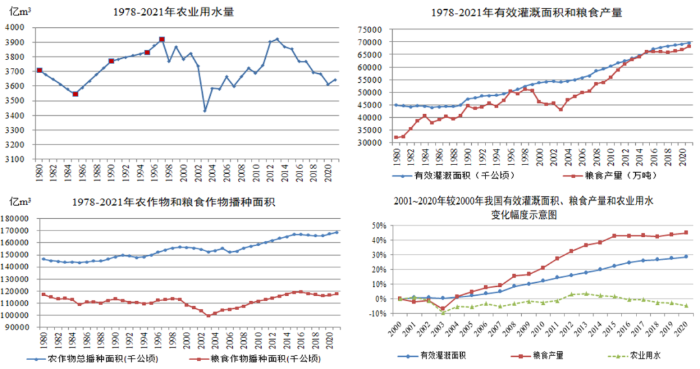 我國(guó)用水量轉(zhuǎn)型特點(diǎn)及水網(wǎng)建設(shè)建議 邢智慧 姜富華 曲永會(huì) 水是生存之本、文明之源、生態(tài)之基。新中國(guó)成立以來(lái),我國(guó)開展了大規(guī)模水利基礎(chǔ)設(shè)施建設(shè),水安全保障能力顯著提升,為我國(guó)經(jīng)濟(jì)社會(huì)高質(zhì)量發(fā)展奠定了堅(jiān)實(shí)的基礎(chǔ)。水資源對(duì)經(jīng)濟(jì)社會(huì)發(fā)展提供重要基礎(chǔ)支撐的同時(shí),也對(duì)其形成一定制約,進(jìn)而促進(jìn)了技術(shù)進(jìn)步和集約節(jié)約利用,最終對(duì)用水產(chǎn)生較大影響。長(zhǎng)期以來(lái),我國(guó)按照以需定供的原則開展供水工程規(guī)劃設(shè)計(jì),需水預(yù)測(cè)是核心環(huán)節(jié),不同時(shí)期經(jīng)濟(jì)社會(huì)發(fā)展與用水的關(guān)系有規(guī)可循,并對(duì)工程規(guī)模確定有著至關(guān)重要的作用。因此,研判好經(jīng)濟(jì)社會(huì)用水趨勢(shì),對(duì)科學(xué)合理配置水資源和建設(shè)國(guó)家水網(wǎng)工程具有重要意義。本文通過(guò)分析新中國(guó)成立以來(lái)用水與經(jīng)濟(jì)社會(huì)發(fā)展之間的關(guān)系,探索內(nèi)在發(fā)展變化規(guī)律,為完善水安全保障工程體系提供參考。 一、不同時(shí)期用水總體變化趨勢(shì) 新中國(guó)成立70多年來(lái),經(jīng)濟(jì)和人民生活水平發(fā)生了翻天覆地的變化。2021年全國(guó)GDP達(dá)到114萬(wàn)億元[1],按不變價(jià)計(jì)算,比新中國(guó)成立之初的1952年增長(zhǎng)了200多倍,創(chuàng)造了從一窮二白到經(jīng)濟(jì)總量穩(wěn)居世界第二位的發(fā)展奇跡。相應(yīng)地,我國(guó)用水總量也從1000億m3左右[2]增加至5920億m3左右[3],增加了近5倍。 從用水態(tài)勢(shì)變化看,1949~1980年(新中國(guó)成立~改革開放之初)我國(guó)年均用水總量增幅約4.74%,生活、工業(yè)和農(nóng)業(yè)用水量均大幅增加,但驅(qū)動(dòng)用水增加主要來(lái)自農(nóng)業(yè)。農(nóng)業(yè)用水量由不足1000億m3增加到3700億m3左右,對(duì)總用水量增長(zhǎng)的貢獻(xiàn)度超過(guò)85%,這是新中國(guó)成立后我國(guó)為解決溫飽問題進(jìn)行廣泛開荒種糧和大力發(fā)展灌溉的結(jié)果。 1980~2021年(改革開放以來(lái))我國(guó)用水總量增幅明顯回落,年均增幅約0.84%。不同于前一階段,雖然我國(guó)糧食產(chǎn)量不斷增加,但農(nóng)業(yè)用水量基本不變或變幅極小,生活、工業(yè)、生態(tài)用水對(duì)總用水量的影響作用較大。 注:本圖中1995年以前的用水量根據(jù)1949年、1980年、1985年、1990年和1995年用水總量[2]進(jìn)行插補(bǔ);1996年用水量根據(jù)1995年和1997年插補(bǔ);1997~2021年數(shù)據(jù)來(lái)自全國(guó)水資源公報(bào)。 圖1 新中國(guó)成立以來(lái)我國(guó)用水態(tài)勢(shì)變化示意圖(單位:億m3) 二、近年用水總量已出現(xiàn)平穩(wěn)略降的態(tài)勢(shì) 改革開放之初的1978年,我國(guó)總?cè)丝?6259萬(wàn)人,GDP約3678.7億元。到2021年,我國(guó)總?cè)丝谝堰_(dá)141260萬(wàn)人,GDP達(dá)到1143669.7億元[1]分別約為1978年的1.46倍和310倍。1980年我國(guó)總用水量約4200億m3[2],到2021年增長(zhǎng)至5920億m3[3],為1980年的1.4倍。用水增幅低于人口增速,遠(yuǎn)低于經(jīng)濟(jì)增速。 分階段看,1980~1997年我國(guó)用水總量以年均1.67%的增幅增加,該時(shí)期我國(guó)處于十一屆三中全會(huì)到亞洲金融危機(jī)爆發(fā)前期的發(fā)展階段,人口、城鎮(zhèn)化、經(jīng)濟(jì)總量、糧食產(chǎn)量等保持較高水平的增長(zhǎng)。1997~2004年我國(guó)用水總量總體基本不變,該時(shí)期受亞洲金融危機(jī)影響等,除城鎮(zhèn)化率外,人口、經(jīng)濟(jì)總量、糧食產(chǎn)量等增長(zhǎng)速度均有所回落。2004~2013年我國(guó)用水總量以年均1.21%的增幅增加,用水量恢復(fù)較快增長(zhǎng)。該階段我國(guó)加入了世界貿(mào)易組織,經(jīng)濟(jì)增長(zhǎng)迅速,超越美國(guó)成為全球貨物貿(mào)易第一大國(guó),經(jīng)濟(jì)總量超過(guò)日本躍升到世界第二位,成為世界第二大經(jīng)濟(jì)體。雖然我國(guó)人口、城鎮(zhèn)化發(fā)展增長(zhǎng)速度減緩,但經(jīng)濟(jì)總量和糧食產(chǎn)量均以改革開放以來(lái)最快速度增加。2013~2021年我國(guó)用水總量增長(zhǎng)率下降為0.54%,該階段處于黨的十八大以來(lái)倡導(dǎo)高質(zhì)量發(fā)展的階段。我國(guó)全面建成小康社會(huì),實(shí)現(xiàn)了第一個(gè)百年目標(biāo),大力推進(jìn)生態(tài)文明建設(shè),經(jīng)濟(jì)由高速發(fā)展階段轉(zhuǎn)向了高質(zhì)量發(fā)展階段。相應(yīng)地,我國(guó)人口、城鎮(zhèn)化、經(jīng)濟(jì)總量、糧食產(chǎn)量等增長(zhǎng)速度均放緩。同時(shí),《國(guó)務(wù)院關(guān)于實(shí)行最嚴(yán)格水資源管理制度的意見》(國(guó)發(fā)〔2012〕3號(hào))、《實(shí)行最嚴(yán)格水資源管理制度考核辦法》(國(guó)發(fā)〔2013〕2號(hào))等政策相繼出臺(tái),從而全面推進(jìn)節(jié)水型社會(huì)建設(shè)。 圖2 改革開放以來(lái)用水及經(jīng)濟(jì)發(fā)展趨勢(shì)變化示意圖 綜合上述分析,用水量與人口和經(jīng)濟(jì)發(fā)展態(tài)勢(shì)密切相關(guān),并且隨著我國(guó)經(jīng)濟(jì)社會(huì)由
