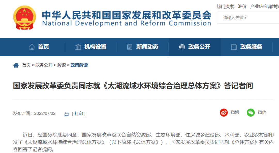 2022年7月,經(jīng)國務(wù)院同意,國家發(fā)展改革委、自然資源部、生態(tài)環(huán)境部、住房和城鄉(xiāng)建設(shè)部、水利部、農(nóng)業(yè)農(nóng)村部等六部門聯(lián)合印發(fā)了《太湖流域水環(huán)境綜合治理總體方案(2012-2035年)(以下簡稱《總體方案》)。《總體方案》是對新時(shí)期太湖流域水環(huán)境綜合治理的全面部署,對持續(xù)推動(dòng)太湖水環(huán)境質(zhì)量穩(wěn)中向好,繼續(xù)實(shí)現(xiàn)“兩個(gè)確?!蹦繕?biāo),有效服務(wù)長江經(jīng)濟(jì)帶和長三角一體化高質(zhì)量發(fā)展意義重大。