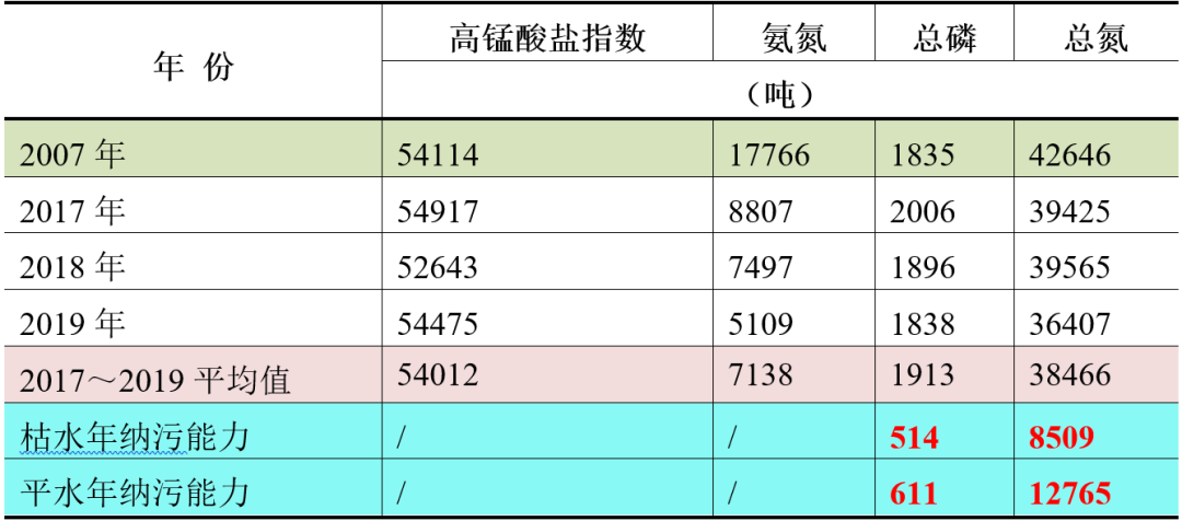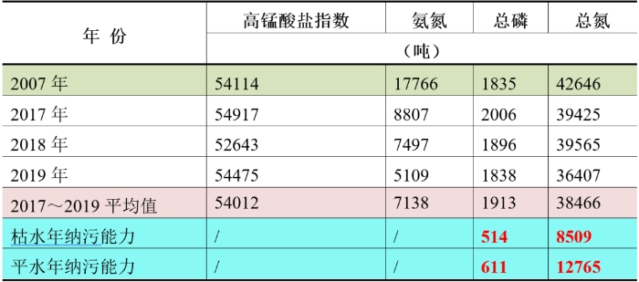 根據(jù)太湖局對主要入湖河道水質(zhì)、水量的同步監(jiān)測數(shù)據(jù)分析計(jì)算求得入太湖污染物總量,結(jié)果表明:與基準(zhǔn)年2007年相比,近三年(2017~2019年)入湖污染物總量年均值高錳酸鹽指數(shù)為54012噸,與基準(zhǔn)年基本持平;氨氮為7138噸,比基準(zhǔn)年下降59.8%;總磷為1913噸,比基準(zhǔn)年增加4.3%;總氮為38466噸,比基準(zhǔn)年下降9.8%(見表2)。近三年太湖總磷、總氮年均入湖負(fù)荷為《總體方案》確定的枯水年太湖總磷、總氮納污能力3.7倍和4.5倍,為太湖局核算的平水年相應(yīng)納污能力的3.1倍和3.0倍。