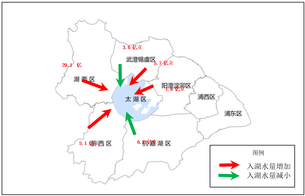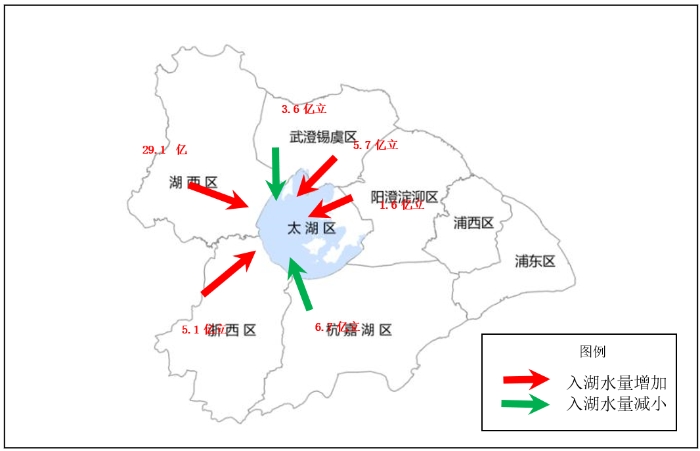 從長系列水文資料看,2007~2019年太湖流域處于相對豐水期。2007~2019年環(huán)太湖年均入湖水量達(dá)到112.0億立方米,較1986~2006年均值增加31.0億立方米,增幅38%。入湖水量的增加主要來自湖西區(qū)、浙西區(qū),其中湖西區(qū)年均值增加29.1億立方米,浙西區(qū)增加5.1億立方米,杭嘉湖區(qū)減少6.7億立方米。望虞河2007~2019年均通過望亭水利樞紐入太湖水量7.9億立方米。
