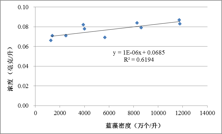 根據(jù)太湖局長系列太湖總磷和藍(lán)藻密度監(jiān)測結(jié)果進(jìn)行相關(guān)分析,結(jié)果表明總磷和藍(lán)藻密度呈較好的正相關(guān)關(guān)系,相關(guān)系數(shù)為0.79(見圖7)。