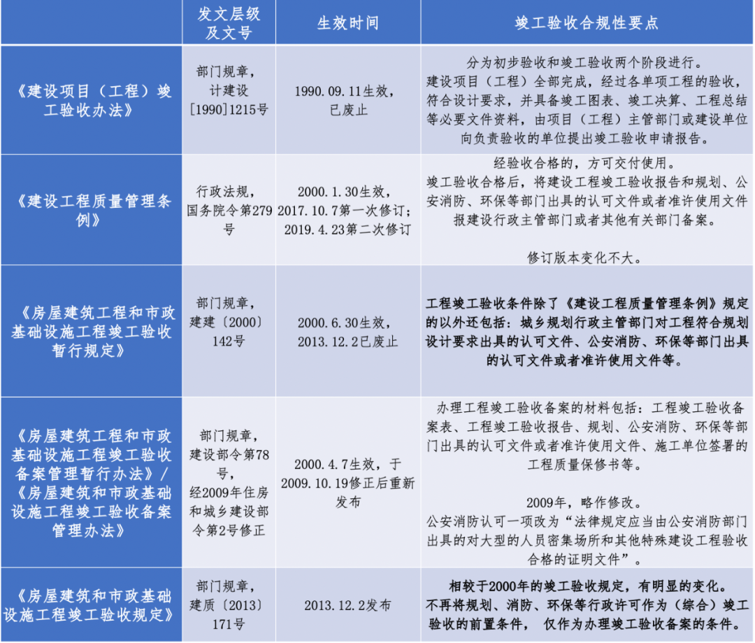 表2 竣工驗(yàn)收(綜合驗(yàn)收)手續(xù)沿革及合規(guī)性要點(diǎn)