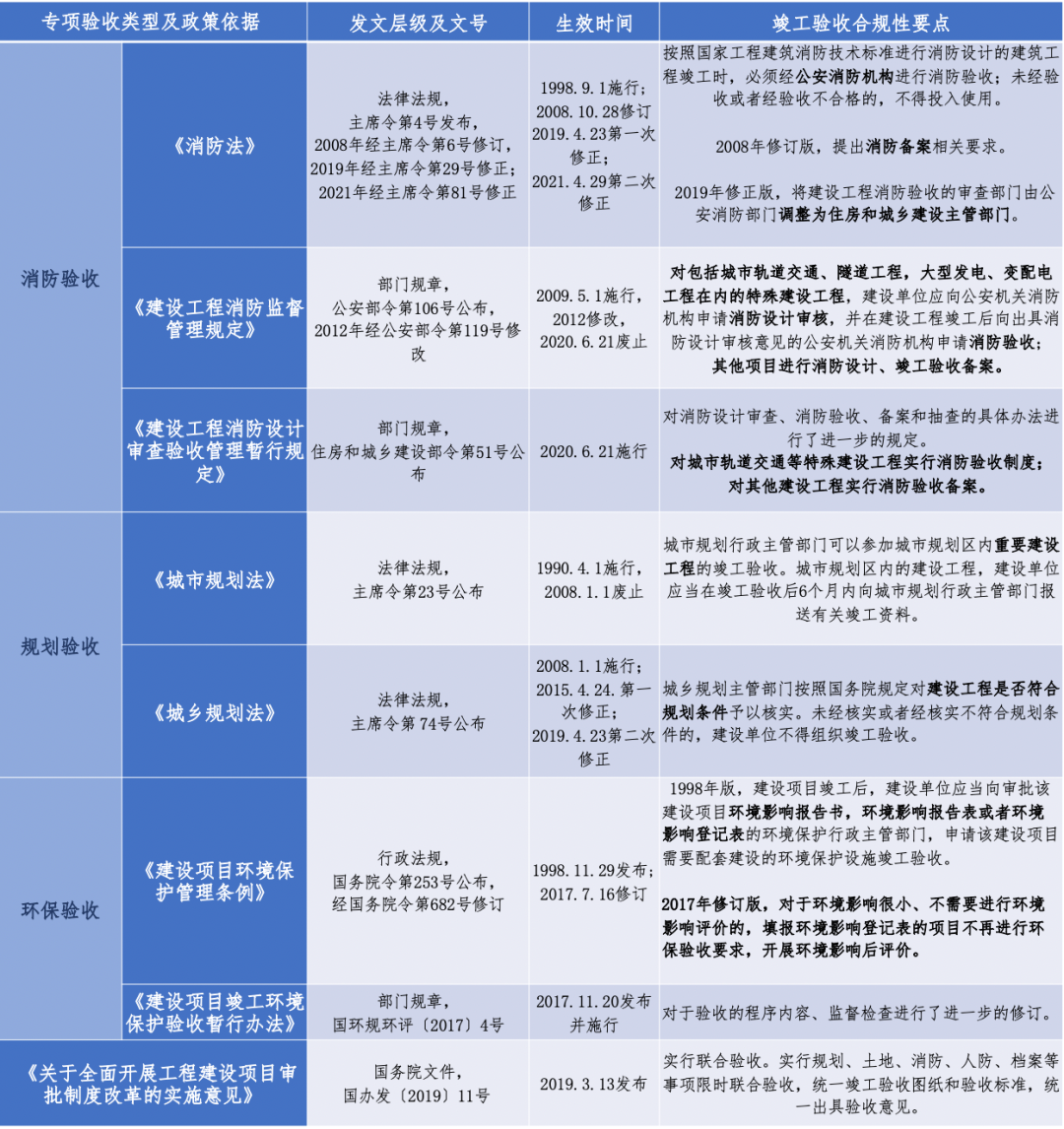 由于規(guī)劃、消防、環(huán)保等涉及到安全及公共利益,我國對這些專項(xiàng)建筑功能實(shí)施行政許可或?qū)徟?strong style="margin: 0px; padding: 0px; outline: 0px; max-width: 100%; box-sizing: border-box !important; overflow-wrap: break-word !important;">工程項(xiàng)目涉及的專項(xiàng)驗(yàn)收事項(xiàng)主要包括規(guī)劃驗(yàn)收、消防驗(yàn)收、人防驗(yàn)收、環(huán)保驗(yàn)收、節(jié)能驗(yàn)收、檔案驗(yàn)收等。本部分以消防驗(yàn)收、規(guī)劃驗(yàn)收、環(huán)境驗(yàn)收為例,簡要闡述專項(xiàng)驗(yàn)收手續(xù)的歷史沿革及合規(guī)性要點(diǎn)。