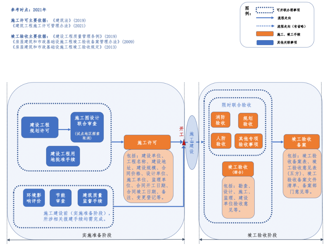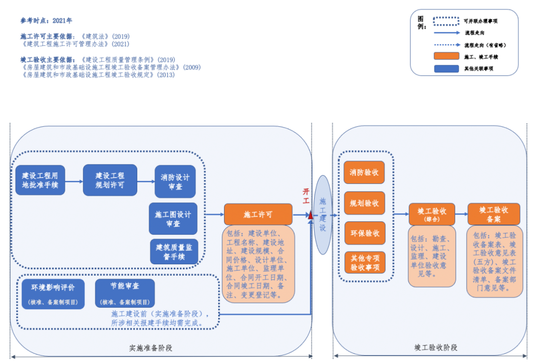施工許可是建筑施工單位符合施工條件、允許開工的批準(zhǔn)文件,是建設(shè)單位進(jìn)行工程施工的法律憑證??⒐を?yàn)收一般包括綜合驗(yàn)收和專項(xiàng)驗(yàn)收。綜合驗(yàn)收是建設(shè)工程項(xiàng)目竣工后,全面考核建設(shè)工作,檢查是否符合設(shè)計(jì)要求和工程質(zhì)量的重要環(huán)節(jié);消防、規(guī)劃、環(huán)保等專項(xiàng)驗(yàn)收既是工程質(zhì)量的必要組份,也是行政機(jī)關(guān)對驗(yàn)收內(nèi)容的專項(xiàng)審查。竣工驗(yàn)收備案是建設(shè)單位組織設(shè)計(jì)、施工、監(jiān)理等有關(guān)單位竣工驗(yàn)收合格之后,將工程建設(shè)和竣工過程中的文件報(bào)相關(guān)建設(shè)主管部門歸檔備查的重要程序,讓行政機(jī)關(guān)知悉竣工事宜。在過去二三十載,有關(guān)法規(guī)政策對以施工許可和竣工驗(yàn)收為代表的基礎(chǔ)設(shè)施項(xiàng)目建設(shè)施工方面的手續(xù)要求,整體上呈現(xiàn)較強(qiáng)的穩(wěn)定性,但也隨著法規(guī)政策演進(jìn)和機(jī)構(gòu)職能調(diào)整發(fā)生了一些變化,下文分別以2012年和2021年作為參考時點(diǎn)進(jìn)行相關(guān)手續(xù)的梳理和總結(jié)。