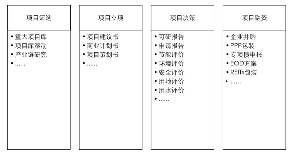 在各地項目謀劃實踐中,項目謀劃有狹義與廣義兩種范疇。所謂狹義的項目謀劃,是為配合發(fā)展規(guī)劃、區(qū)域規(guī)劃或專項規(guī)劃的落地實施,提高規(guī)劃的針對性和操作性,研究提出未來一段時間部署實施的重大項目安排,包括篩選項目、提出重大項目入庫清單,以及根據新形勢新變化新要求,動態(tài)優(yōu)化調整重大項目庫。所謂廣義的項目謀劃,則覆蓋了整個項目前期階段,包括研究重大項目總體安排、開展重點項目前期研究等任務。本文探討廣義的項目謀劃,包括階段劃分和主要工作。 一、項目謀劃的階段劃分 基于全過程管理理念,世界銀行、亞洲開發(fā)銀行等國際金融組織通常將項目周期劃分為“項目提出與篩選、項目前期研究、項目評估與決策、項目建設實施、項目運營及后評價”五個階段。借鑒國際項目管理經驗,國內將“項目提出與篩選、項目前期研究、項目評估與決策”三個階段納入項目前期管理工作,同時建立和強化了項目中期監(jiān)督管理和后評價制度。 項目謀劃覆蓋整個項目前期,可劃分為“項目篩選、項目立項、項目決策和項目融資”四個階段,這是項目研究逐步深入、認識不斷深化、質量漸次提高、成果優(yōu)化完善的過程,涉及投資機會研究、項目初步可研和可行性研究,項目儲備、包裝、申報,包括企業(yè)并購、專項債、PPP、EOD和REITs方案等具體工作。 圖1 項目周期 圖2 項目謀劃的主要階段 二、項目謀劃的主要工作 (一)項目篩選階段 項目篩選階段的主要工作是研究提出重大項目清單,并根據形勢變化進行優(yōu)化調整,以及開展重點產業(yè)鏈創(chuàng)新研究,提出產業(yè)鏈、產業(yè)空間布局圖、企業(yè)分工協(xié)作鏈等。 ——研究提出重大項目清單。近年來,各地在開展國民經濟和社會發(fā)展五年規(guī)劃、產業(yè)發(fā)展和區(qū)域發(fā)展等中長期規(guī)劃時,為了提高規(guī)劃的針對性、指導性和可操作性,都以重大項目為抓手,優(yōu)先保障土地、能源等要素資源,研究提出未來一段時期的重大項目建設安排,并在資金財政、金融信貸等方面予以支持。本階段項目謀劃的主要工作是分析發(fā)展基礎,查找問題短板,把握政策規(guī)劃,跟蹤行業(yè)動向,研究市場需求,征求篩選提出重大項目清單,納入各地發(fā)改委重大項目庫管理。各地在推薦申報中央和地方財政預算各類專項時,一般也會將項目入庫作為前置條件。 ——動態(tài)優(yōu)化調整項目清單。由于中長期規(guī)劃執(zhí)行期通常都在3-5年或是5-10年,有的甚至長達10-15年。在此期間,市場、技術、政策、規(guī)劃、環(huán)境、資源等都可能發(fā)生變化,甚至出現重大變化。比如2020年開始持續(xù)三年的全球新冠疫情、美國主導的逆全球化和我國構建“以國內大循環(huán)為主體、國內國際雙循環(huán)相互促進”新發(fā)展格局、全面建設社會主義現代化國家。面對新階段新形勢新任務,各地在開展“十四五”規(guī)劃中期評估中,都會重新審視規(guī)劃目標、指標和主要任務,以及重大項目安排,并對規(guī)劃進行修編,對重大項目安排進行調整、補充、完善。 ——重點產業(yè)鏈創(chuàng)新研究。開展產業(yè)鏈創(chuàng)新研究,從中尋找關鍵薄弱環(huán)節(jié),提出“延鏈、補鏈、強鏈”重大項目,建立產業(yè)鏈推進鏈長制,強力推動產業(yè)集聚集群發(fā)展,是各地項目謀劃的創(chuàng)新模式。產業(yè)鏈作為暢通國民經濟循環(huán)的橋梁和紐帶,在構建雙循環(huán)新發(fā)展格局中的作用至關重要。通過產業(yè)鏈創(chuàng)新研究,聚焦龍頭企業(yè)不強、產業(yè)鏈條不完善、整體產業(yè)規(guī)模待提升等問題,以構建全產業(yè)鏈生態(tài)、增強產業(yè)安全韌性為目標,加快促進產業(yè)鏈上下游、產供銷、大中小企業(yè)協(xié)同發(fā)展,暢通產業(yè)循環(huán)、市場循環(huán)、經濟社會循環(huán),推動產業(yè)高質量發(fā)展。 (二)項目立項階段 項目立項階段的主要工作是預可行性研究,編制項目預可行性研究報告、商業(yè)計劃書、項目策劃書等。 ——預可行性研究。又稱初步可行性研究、項目建議書或立項申請報告。由項目發(fā)起人(籌建單位或項目法人)根據國家和地方中長期規(guī)劃、產業(yè)政策、生產力布局、國內外市場、所在地的內外部條件,就某一新建、擴建或改造項目提出的項目建議文件,是對擬建項目的框架性的總體設想。重點論述項目建設的必要性,把項目投資的設想變?yōu)楦怕缘耐顿Y建議。按照國內投資項目管理制度規(guī)定,項目建議書是項目發(fā)起人向政府投資主管部門上報以獲得項目立項的申報文件,為項目審批機關作出初步決策提供必要依據。項目建議書也是大型、復雜投資項目前期研究不可或缺的重要環(huán)節(jié),可以減少項目選擇的盲目性,為下一步可行性研究打下基礎。 ——編制商業(yè)計劃書。商業(yè)計劃書是項目單位為獲得招商融資和其它發(fā)展目標,根據一定的格式和內容要求,向受眾全面展示公司和項目狀況、發(fā)展計劃和未來潛力的報告。主要意圖是給投資者提供一份創(chuàng)業(yè)的項目介紹,展現創(chuàng)業(yè)項目的潛力和價值,便于投資者準確評判企業(yè)或項目,并說服他們對項目進行投資,從而使企業(yè)獲得融資