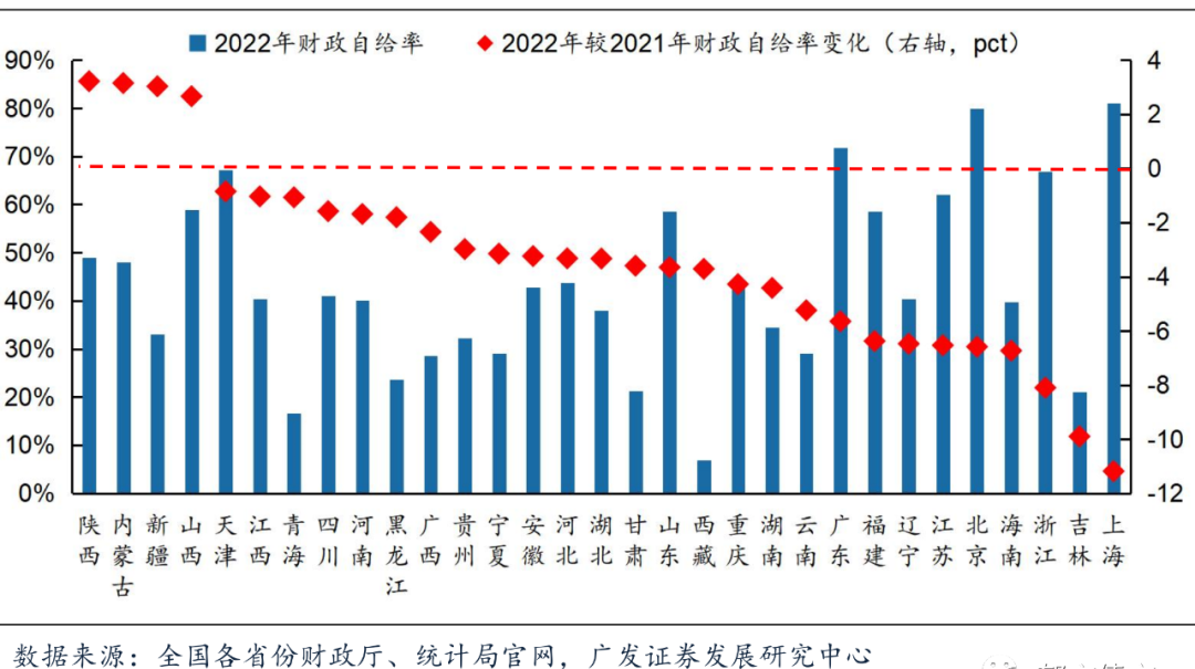 財政自給率是要衡量地方本級收入與最終支出的比例關(guān)系,財政自給率越高,表明地方財政平衡能力越強,經(jīng)濟發(fā)展越健康。2022年,僅陜西、內(nèi)蒙古、新疆和山西公共預(yù)算收入大幅增長,其余27省財政自給率均有所下降,其中上海、吉林財政自給率下降超過10個百分點,浙江、海南、北京和江蘇財政自給率也下降較多。另外,隨著土地紅利逐漸消解,地方政府土地出讓收入持續(xù)下降。因此,發(fā)展壯大主導(dǎo)產(chǎn)業(yè),打造高質(zhì)量產(chǎn)業(yè)體系,擴大稅收收入占比,提升財政收入質(zhì)量,已成為各地方政府未來工作的重中之重。