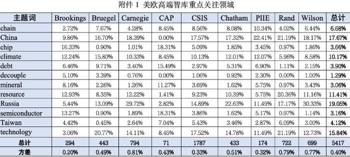 一、研究背景 美歐智庫(kù)是全球智庫(kù)體系中的重要組成部分,其發(fā)展起步較早,發(fā)展模式較好,行業(yè)規(guī)范更成熟,是美歐國(guó)家的重要政策智囊,在全球高端輿論體系中有著重要的地位。總體來(lái)看,美歐智庫(kù)在數(shù)量和影響力方面處于世界領(lǐng)先地位,其發(fā)布的觀點(diǎn)、分析和評(píng)論也成為了當(dāng)下了解美歐國(guó)家政府內(nèi)部認(rèn)知和社會(huì)公共輿論的一扇重要窗口。 一般對(duì)于智庫(kù)的研究報(bào)告都以文獻(xiàn)閱讀、分析、總結(jié)為主,多針對(duì)一篇或幾篇報(bào)告進(jìn)行分析。這種研究方式的優(yōu)勢(shì)是分析更為透徹和深入,但是由于個(gè)人精力、關(guān)注方向的局限性,容易陷入“信息繭房”,對(duì)整體方向的把握比較散亂。本報(bào)告屬于美歐智庫(kù)成果大數(shù)據(jù)研究系列,旨在持續(xù)跟蹤美歐智庫(kù)研究動(dòng)向,更全面了解美歐國(guó)家對(duì)國(guó)際政治、經(jīng)濟(jì)貿(mào)易、中國(guó)發(fā)展等關(guān)鍵領(lǐng)域的認(rèn)知情況。 二、樣本選取 研究樣本選取美國(guó)布魯金斯學(xué)會(huì)(Brookings)、美國(guó)卡內(nèi)基國(guó)際和平基金會(huì)(Carnegie)、比利時(shí)布魯蓋爾研究所(Bruegel)、美國(guó)戰(zhàn)略與國(guó)際問(wèn)題研究中心(CSIS)、英國(guó)皇家國(guó)際事務(wù)研究所(Chatham)、美國(guó)蘭德公司(Rand)、美國(guó)彼得森國(guó)際經(jīng)濟(jì)研究所(PIIE)、威爾遜中心(Wilson)和美國(guó)進(jìn)步中心(CAP)等9家智庫(kù)。 樣本報(bào)告研究覆蓋關(guān)于中國(guó)、產(chǎn)業(yè)鏈、芯片、氣候、債務(wù)、脫鉤、礦物、資源、俄羅斯、半導(dǎo)體、臺(tái)灣、技術(shù)等相關(guān)領(lǐng)域的研究報(bào)告,共計(jì)5417篇。 三、文本數(shù)據(jù)分析 (一)各智庫(kù)關(guān)注領(lǐng)域 2023上半年,各歐美智庫(kù)與中國(guó)、俄羅斯等相關(guān)的主題報(bào)告占比在五分之二左右,與供應(yīng)鏈、芯片產(chǎn)業(yè)、半導(dǎo)體產(chǎn)業(yè)、礦產(chǎn)產(chǎn)業(yè)、脫鉤等相關(guān)的主題報(bào)告占比在五分之一左右,與氣候、資源、債務(wù)等相關(guān)的主題報(bào)告占比約五分之一,與臺(tái)灣、科技主題相關(guān)的報(bào)告約占五分之一。不同主題下智庫(kù)關(guān)注的重點(diǎn)領(lǐng)域分析參見附件1。 1.布魯蓋爾:中國(guó)和科技 布魯蓋爾研究所注重中國(guó)問(wèn)題和科技前沿產(chǎn)業(yè)的研究。在限制中國(guó)科技發(fā)展的問(wèn)題上,布魯蓋爾指出,越來(lái)越多的研究員擔(dān)心美國(guó)在基礎(chǔ)研究方面的開放可能過(guò)于支持競(jìng)爭(zhēng)對(duì)手。隨著科技水平在一些關(guān)鍵領(lǐng)域取得的重大突破、全球化信息環(huán)境的形成、以及國(guó)際經(jīng)濟(jì)聯(lián)系的深化和多樣化,各國(guó)的相互依存將不可分離,高技術(shù)產(chǎn)業(yè)針對(duì)某一國(guó)家和地區(qū)進(jìn)行全面封鎖將愈加困難。在科技前沿產(chǎn)業(yè)研究中,布魯蓋爾對(duì)由國(guó)防部、聯(lián)合作戰(zhàn)指揮部、海軍、海軍陸戰(zhàn)隊(duì)、國(guó)防機(jī)構(gòu)和國(guó)防情報(bào)部門聯(lián)合資助的蘭德公司國(guó)防研究所進(jìn)行了重點(diǎn)分析,認(rèn)為美國(guó)應(yīng)繼續(xù)通過(guò)軍工聯(lián)合體推進(jìn)前沿科技轉(zhuǎn)化的研究工作。 2.布魯金斯:芯片和資源 布魯金斯學(xué)會(huì)的研究領(lǐng)域較為廣泛,其研究相對(duì)側(cè)重芯片和資源。布魯金斯認(rèn)為美國(guó)利用其在國(guó)際組織如多邊開發(fā)銀行中的股權(quán)影響力,支持美國(guó)在外交、安全和經(jīng)濟(jì)方面的政策和活動(dòng),特別是對(duì)芯片技術(shù)的封鎖。布魯金斯通過(guò)對(duì)關(guān)鍵礦產(chǎn)供應(yīng)問(wèn)題的大量分析,如美國(guó)和日本宣布的關(guān)于電池礦物采購(gòu)、美國(guó)對(duì)加拿大礦業(yè)項(xiàng)目的融資貿(mào)易協(xié)議,提出應(yīng)加強(qiáng)關(guān)注部分關(guān)鍵產(chǎn)業(yè)供應(yīng)鏈上游礦產(chǎn)品,目前美國(guó)部分利益團(tuán)體已經(jīng)加強(qiáng)該類產(chǎn)品的供應(yīng)安全,對(duì)相關(guān)風(fēng)險(xiǎn)有所警惕和防范。 3.卡內(nèi)基:中國(guó)和俄羅斯 卡內(nèi)基國(guó)際和平基金會(huì)的研究具有鮮明的特色,以俄羅斯、中國(guó)問(wèn)題為研究重點(diǎn),相關(guān)報(bào)告約占其研究報(bào)告總量的一半。針對(duì)俄羅斯,卡內(nèi)基提出目前正在美國(guó)執(zhí)行的三大舉措包括加強(qiáng)對(duì)烏克蘭的戰(zhàn)爭(zhēng)支持、維持對(duì)俄羅斯的制裁和加強(qiáng)北約的東部防線,成功搭建了遏制俄羅斯發(fā)展的政策框架,未來(lái)應(yīng)立足這三大核心進(jìn)一步強(qiáng)化對(duì)俄政策。圍繞烏克蘭提出的《基輔安全協(xié)議保障草案》,美國(guó)仍在權(quán)衡是否將目前的支持轉(zhuǎn)化為更持久的框架。卡內(nèi)基提出,美國(guó)對(duì)烏克蘭的軍事援助已經(jīng)在美國(guó)政府內(nèi)部產(chǎn)生爭(zhēng)議,特別是美國(guó)總統(tǒng)選舉即將到來(lái)的窗口期日益臨近,各個(gè)候選人團(tuán)隊(duì)會(huì)在這段時(shí)間重新研究對(duì)烏援助計(jì)劃,以爭(zhēng)取選民和國(gu