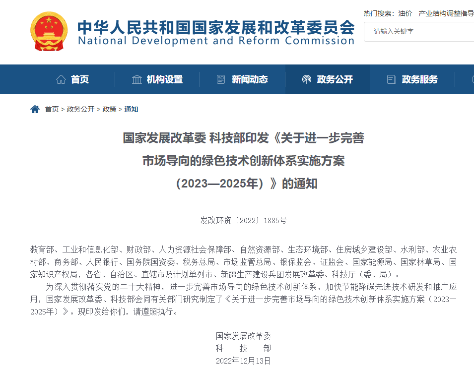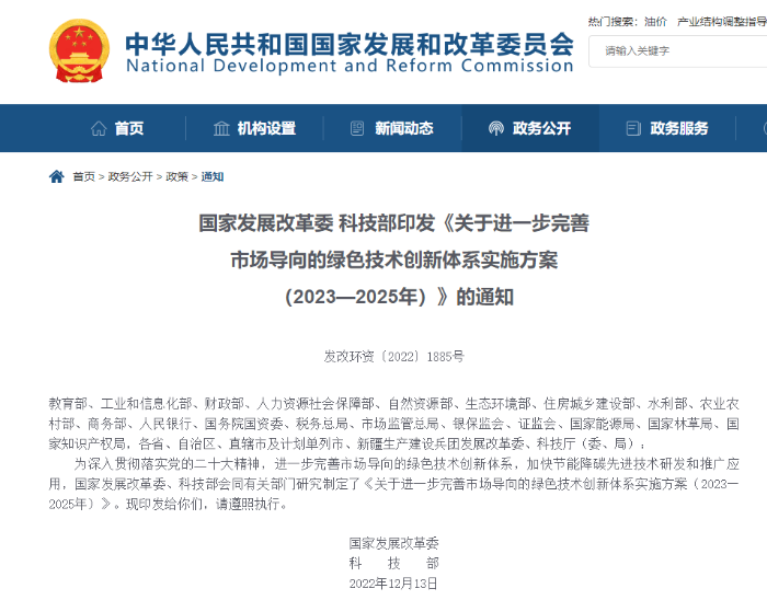 “十四五”時期,我國生態(tài)文明建設(shè)進入以降碳為重點戰(zhàn)略方向、推動減污降碳協(xié)同增效、促進經(jīng)濟社會發(fā)展全面綠色轉(zhuǎn)型、實現(xiàn)生態(tài)環(huán)境質(zhì)量改善由量變到質(zhì)變的關(guān)鍵時期,綠色技術(shù)創(chuàng)新對綠色低碳發(fā)展的關(guān)鍵支撐作用愈加凸顯。為進一步完善市場導(dǎo)向的綠色技術(shù)創(chuàng)新體系,持續(xù)強化綠色技術(shù)創(chuàng)新對綠色低碳發(fā)展的支撐作用,國家發(fā)展改革委、科技部聯(lián)合印發(fā)了《關(guān)于進一步完善市場導(dǎo)向的綠色技術(shù)創(chuàng)新體系實施方案(2023—2025年)》(發(fā)改環(huán)資〔2022〕1885號),對未來三年完善市場導(dǎo)向的綠色技術(shù)創(chuàng)新體系工作進行了系統(tǒng)部署,為加快發(fā)展方式綠色低碳轉(zhuǎn)型、推動高質(zhì)量發(fā)展提供有力科技支撐。
