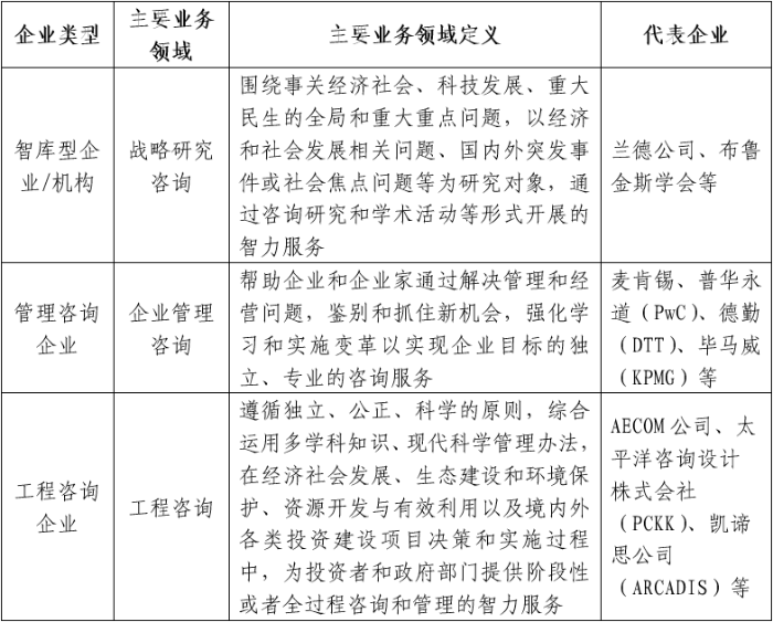 中咨公司與世界一流咨詢企業(yè)對(duì)比研究 中咨公司“青馬工程”第四小組 陳佳鵬 譚瀟 王晶晶 等 一、研究背景 (一)研究目的 黨的二十大報(bào)告提出,要“深化國(guó)資國(guó)企改革,加快國(guó)有經(jīng)濟(jì)布局優(yōu)化和結(jié)構(gòu)調(diào)整,推動(dòng)國(guó)有資本和國(guó)有企業(yè)做強(qiáng)做優(yōu)做大,提升企業(yè)核心競(jìng)爭(zhēng)力”“完善中國(guó)特色現(xiàn)代企業(yè)制度,弘揚(yáng)企業(yè)家精神,加快建設(shè)世界一流企業(yè)”,這些都為國(guó)資國(guó)企以實(shí)際行動(dòng)全面建設(shè)社會(huì)主義現(xiàn)代化國(guó)家、以中國(guó)式現(xiàn)代化推進(jìn)中華民族偉大復(fù)興提供了根本遵循。 《國(guó)企改革三年行動(dòng)方案(2020-2022年)》和《關(guān)于開(kāi)展對(duì)標(biāo)世界一流管理提升行動(dòng)的通知》(國(guó)資發(fā)改革〔2020〕39號(hào)),要求中央企業(yè)要對(duì)標(biāo)世界一流企業(yè),通過(guò)管理提升,建設(shè)成為具有全球競(jìng)爭(zhēng)力的企業(yè)。中國(guó)國(guó)際工程咨詢有限公司(以下簡(jiǎn)稱中咨公司)“十四五”規(guī)劃明確提出,未來(lái)發(fā)展要聚焦于實(shí)現(xiàn)建成國(guó)家高端智庫(kù)和世界一流咨詢機(jī)構(gòu)的戰(zhàn)略目標(biāo),指明了公司的前進(jìn)方向。 為深入貫徹黨的二十大報(bào)告關(guān)于國(guó)資國(guó)企改革發(fā)展和黨的建設(shè)的重大部署,認(rèn)真落實(shí)國(guó)務(wù)院國(guó)資委關(guān)于中央企業(yè)對(duì)標(biāo)世界一流管理提升改革行動(dòng)計(jì)劃的相關(guān)部署和中咨公司“十四五”發(fā)展規(guī)劃,以推動(dòng)公司高質(zhì)量發(fā)展為主題,以改革創(chuàng)新為根本動(dòng)力,緊扣“加快建設(shè)世界一流咨詢機(jī)構(gòu)”目標(biāo),通過(guò)選取咨詢領(lǐng)域有較強(qiáng)影響力的標(biāo)桿企業(yè)開(kāi)展對(duì)比研究,提出中咨公司建設(shè)世界一流咨詢機(jī)構(gòu)的戰(zhàn)略構(gòu)想,進(jìn)一步搶抓高質(zhì)量發(fā)展的重要戰(zhàn)略機(jī)遇期。 (二)對(duì)比范圍 基于中咨公司業(yè)務(wù)范圍與自身戰(zhàn)略規(guī)劃,本次研究將重點(diǎn)選取全球領(lǐng)先的智庫(kù)型企業(yè)、管理咨詢企業(yè)、工程咨詢企業(yè)進(jìn)行對(duì)比研究。 表1 三類咨詢企業(yè)分類一覽表