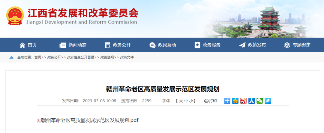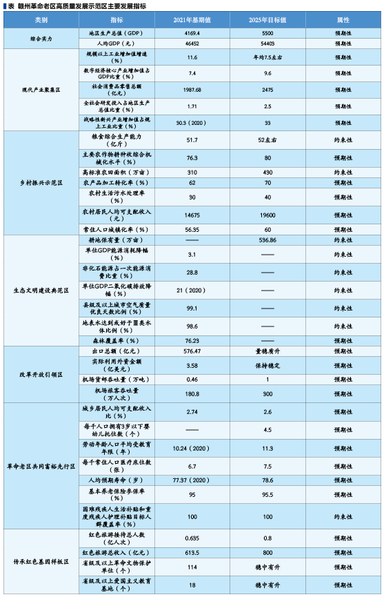 探索革命老區(qū)振興發(fā)展新路徑 ——《贛州革命老區(qū)高質(zhì)量發(fā)展示范區(qū)發(fā)展規(guī)劃》解讀 田煜 董繼紅 贛州革命老區(qū)是土地革命戰(zhàn)爭(zhēng)時(shí)期中央蘇區(qū)的主體和核心區(qū)域,中華蘇維埃共和國(guó)在此奠基,中央紅軍氣壯山河的二萬(wàn)五千里長(zhǎng)征從瑞金、于都等地出發(fā),艱苦卓絕的南方三年游擊戰(zhàn)爭(zhēng)在贛南山區(qū)浴血堅(jiān)持,以毛澤東同志為代表的老一輩無(wú)產(chǎn)階級(jí)革命家在這里留下閃光足跡。黨中央高度關(guān)注贛州革命老區(qū)振興發(fā)展,在習(xí)近平總書記的親自關(guān)心和推動(dòng)下,2012年6月,國(guó)務(wù)院出臺(tái)《關(guān)于支持贛南等原中央蘇區(qū)振興發(fā)展的若干意見(jiàn)》,開啟了贛南蘇區(qū)振興發(fā)展的嶄新篇章。 2021年1月,國(guó)務(wù)院出臺(tái)《關(guān)于新時(shí)代支持革命老區(qū)振興發(fā)展的意見(jiàn)》,提出研究支持贛州、三明等城市建設(shè)革命老區(qū)高質(zhì)量發(fā)展示范區(qū)。2022年3月,國(guó)務(wù)院批復(fù)同意《贛州革命老區(qū)高質(zhì)量發(fā)展示范區(qū)建設(shè)方案》。近期,經(jīng)江西省人民政府同意,《贛州革命老區(qū)高質(zhì)量發(fā)展示范區(qū)發(fā)展規(guī)劃》(以下簡(jiǎn)稱《規(guī)劃》)正式印發(fā)?!兑?guī)劃》明確了示范區(qū)建設(shè)的戰(zhàn)略目標(biāo)、重點(diǎn)任務(wù)和支持政策,為贛州在全國(guó)革命老區(qū)高質(zhì)量發(fā)展上作示范、勇爭(zhēng)先繪就了“路線圖”“施工圖”。 01 《規(guī)劃》為贛南蘇區(qū)振興發(fā)展指明了新發(fā)展階段的行動(dòng)目標(biāo) 黨的十八大以來(lái),在黨中央堅(jiān)強(qiáng)領(lǐng)導(dǎo)和關(guān)心關(guān)懷下,在中央國(guó)家機(jī)關(guān)及有關(guān)單位的鼎力支持下,贛州經(jīng)濟(jì)社會(huì)發(fā)展取得歷史性成就。經(jīng)過(guò)十年振興發(fā)展,經(jīng)濟(jì)實(shí)力大步跨越,2012-2021年,贛州市地區(qū)生產(chǎn)總值從1700億元增至3658億元,年均增速9.2%,高于同期全國(guó)、全省水平2.5、0.5個(gè)百分點(diǎn),人均GDP與全國(guó)平均水平的差距縮小了10.8個(gè)百分點(diǎn);特色產(chǎn)業(yè)揚(yáng)優(yōu)成勢(shì),營(yíng)商環(huán)境持續(xù)優(yōu)化,2022年,實(shí)際利用外資3.73億美元、進(jìn)出口總額1033.1億元,在全國(guó)革命老區(qū)重點(diǎn)城市中位居前列。生態(tài)屏障持續(xù)筑牢,水土保持生態(tài)治理“贛州模式”、山水林田湖草沙綜合治理“尋烏經(jīng)驗(yàn)”在全國(guó)推廣。贛州人民堅(jiān)定執(zhí)著聽黨話、感黨恩、跟黨走,紅色基因薪火相傳,煥發(fā)新的時(shí)代榮光。 立足新階段,《規(guī)劃》錨定2035年與全國(guó)同步基本實(shí)現(xiàn)社會(huì)主義現(xiàn)代化的遠(yuǎn)景目標(biāo),綜合考慮贛州市發(fā)展條件和外部環(huán)境,緊密銜接“十四五”規(guī)劃綱要及各領(lǐng)域?qū)m?xiàng)規(guī)劃,在綜合實(shí)力、產(chǎn)業(yè)發(fā)展、鄉(xiāng)村振興、生態(tài)文明、改革開放、共同富裕、紅色傳承7個(gè)方面設(shè)置了36項(xiàng)主要指標(biāo)。指標(biāo)選取緊扣“6個(gè)區(qū)”戰(zhàn)略定位和“十四五”階段性任務(wù),突出代表性,同時(shí)有利于考核監(jiān)測(cè)任務(wù)的落實(shí)情況。在確定經(jīng)濟(jì)增長(zhǎng)目標(biāo)時(shí),《規(guī)劃》對(duì)標(biāo)“十四五”規(guī)劃綱要,同時(shí)結(jié)合2020-2022年贛州市實(shí)際經(jīng)濟(jì)增長(zhǎng)情況,提出了到2025年GDP突破5500億元的預(yù)期目標(biāo)。在設(shè)置反映產(chǎn)業(yè)發(fā)展的相關(guān)指標(biāo)時(shí),《規(guī)劃》充分對(duì)接經(jīng)濟(jì)高質(zhì)量發(fā)展內(nèi)涵,納入數(shù)字經(jīng)濟(jì)、科技創(chuàng)新等反映質(zhì)量效益的指標(biāo),體現(xiàn)了贛州革命老區(qū)堅(jiān)定不移強(qiáng)化科技創(chuàng)新,著力提升產(chǎn)業(yè)層次的勇氣和決心。 資料來(lái)源:《贛州革命老區(qū)高質(zhì)量發(fā)展示范區(qū)發(fā)展規(guī)劃》 02 《規(guī)劃》聚焦新發(fā)展理念因地制宜謀劃了作示范的六大領(lǐng)域 立足新起點(diǎn),奮進(jìn)新征程,贛州堅(jiān)持在推進(jìn)中國(guó)式現(xiàn)代化的偉大進(jìn)程中,探索革命老區(qū)振興發(fā)展新路徑?!兑?guī)劃》圍繞“六個(gè)作示范”領(lǐng)域,細(xì)化、實(shí)化了構(gòu)建現(xiàn)代產(chǎn)業(yè)體系、全面推進(jìn)鄉(xiāng)村振興、建設(shè)美麗中國(guó)“贛州樣板”、堅(jiān)持深化改革開放、健全公共服務(wù)體系、賡續(xù)紅色血脈六個(gè)方面的重點(diǎn)任務(wù)。 (一)構(gòu)建現(xiàn)代產(chǎn)業(yè)體系,推進(jìn)產(chǎn)業(yè)創(chuàng)新發(fā)展先行示范。習(xí)近平總書記指出,要堅(jiān)持面向世界科技前沿、面向經(jīng)濟(jì)主戰(zhàn)場(chǎng)、面向國(guó)家重大需求、面向人民生命健康,加快實(shí)現(xiàn)高水平科技自立自強(qiáng)。近年來(lái),贛州革命老區(qū)堅(jiān)定不移走集群發(fā)展、創(chuàng)新發(fā)展、融合發(fā)展道路,加快培育特色優(yōu)勢(shì)產(chǎn)業(yè)集群,現(xiàn)代家居產(chǎn)業(yè)從百億“草根經(jīng)濟(jì)”躍升為2500億元的產(ch