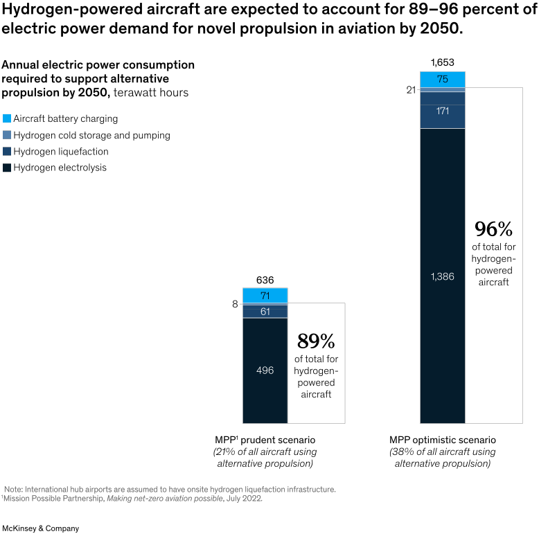 隨著對解決航空業(yè)氣候影響的解決方案的尋求變得更加迫切,人們對例如氫氣、電池電力和混合電力驅動飛機等新型推進技術產生了極大的興趣。根據(jù)MPP對航空業(yè)能源的估計,到2050年,電池電力和氫動力飛機可能占所有飛機的21%-38%,占該行業(yè)整體能源需求的15%-34%。雖然時間上可能感覺很遙遠,但這一新技術將在這十年內出現(xiàn)。 針對這些基礎設施的變化,以及機場和其他利益相關方如何開始準備,仍存在不確定性。近期,麥肯錫發(fā)布了《瞄準低碳:為電池和氫動力飛機提供基礎設施》的報告,旨在幫助人們了解影響新型推進器的一些關鍵考慮因素。