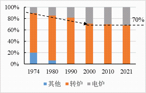從20世紀70年代起,德國部分鋼鐵企業(yè)將原有高爐-轉(zhuǎn)爐長流程工藝改為電弧爐短流程工藝,以滿足城市發(fā)展、環(huán)境保護、原料變化等方面的需要。至21世紀初,德國鋼鐵工業(yè)工藝結(jié)構(gòu)調(diào)整基本結(jié)束,最近20年變化不大。整體上看,德國鋼鐵工業(yè)雖然已形成兩種工藝并行發(fā)展的局面,但傳統(tǒng)長流程企業(yè)仍保持著較大的規(guī)模優(yōu)勢,長流程工藝粗鋼產(chǎn)量占總產(chǎn)量的70%左右。