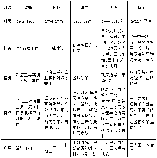 新中國(guó)成立初期,我國(guó)經(jīng)濟(jì)建設(shè)經(jīng)驗(yàn)并不充足,在沒(méi)有太多實(shí)踐的基礎(chǔ)上,為了加快提升經(jīng)濟(jì)總量迅速開(kāi)始探索開(kāi)展生產(chǎn)力布局的嘗試??傮w上經(jīng)歷了“相對(duì)均衡—有所分散—相對(duì)集中—趨于協(xié)調(diào)—注重協(xié)同”五?次重大調(diào)整階段,從而對(duì)我國(guó)區(qū)域開(kāi)發(fā)格局和經(jīng)濟(jì)格局產(chǎn)生了重要影響,奠定了我國(guó)經(jīng)濟(jì)總體持續(xù)穩(wěn)定增長(zhǎng)的基礎(chǔ),形成了門(mén)類(lèi)齊全的工業(yè)產(chǎn)業(yè)體系。相關(guān)情況如下表: