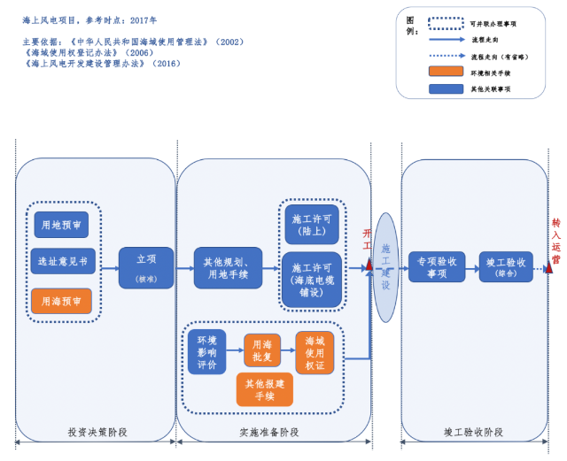 對(duì)于特定行業(yè)或特殊性質(zhì)的基礎(chǔ)設(shè)施項(xiàng)目,項(xiàng)目需依法依規(guī)辦理海域使用、電信業(yè)務(wù)經(jīng)營(yíng)許可、外商投資安全審查等重要手續(xù)。因各行業(yè)之間差異較大,現(xiàn)以海上風(fēng)電項(xiàng)目為例,梳理投資管理手續(xù)脈絡(luò)。