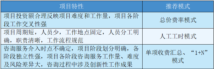 從前述所提及的四個方面,結(jié)合因素分析的結(jié)果,提出如下的全過程工程咨詢服務(wù)酬金計取方式選擇建議。