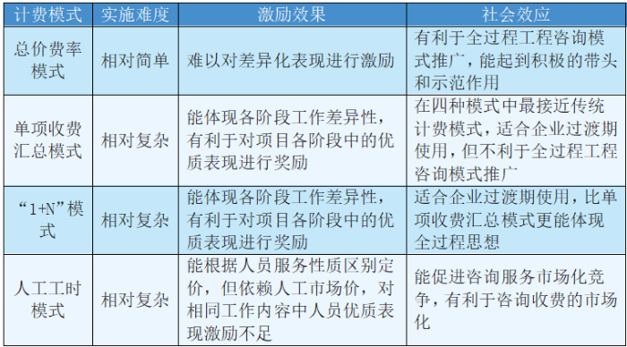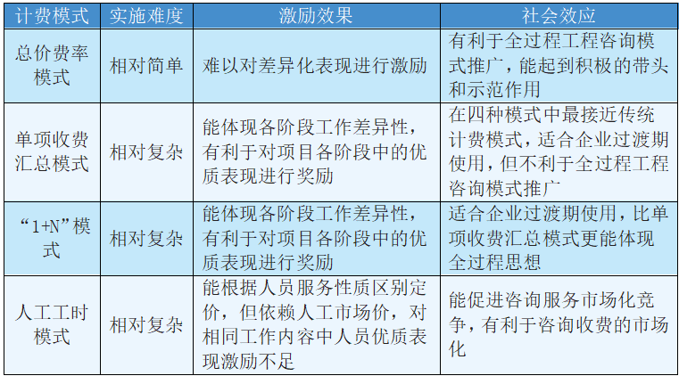 從計費模式本身來看,計算的復(fù)雜性上,單項收費匯總、總價費率、人工工時、“1+N”計費四種計費方式中,單項收費匯總和“1+N”計費計算上更為相近,都是先分階段計費再進行匯總,過程相對繁瑣,總價費率計算上只需確定計費基價和費率,更為便捷。但另一方面,單項收費匯總模式可以參照現(xiàn)有的各階段收費標準,而總價費率模式費率難以確定,人工工時模式除了考慮現(xiàn)有的人工成本規(guī)定還要考慮到各個地區(qū)的經(jīng)濟因素。針對項目的實際情況,各個模式的實施難度不同。