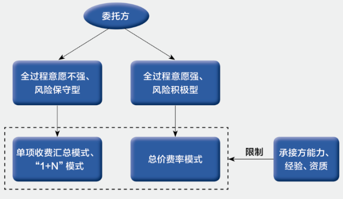 第三,利益相關(guān)者層面來看,項目的完成實際上是委托方與承接方相互協(xié)調(diào)配合的結(jié)果,每一個決策都建立在充分考慮委托方需求和承接方能力的基礎(chǔ)之上。全過程工程咨詢計費模式的選擇要考慮到委托方需求,目前全過程工程咨詢尚處于起步階段,不少建設(shè)單位響應(yīng)國家政策號召,采取全過程咨詢模式,但是該模式作為一種新興模式,建設(shè)單位必然要承擔相應(yīng)風險,需要與建設(shè)單位進行需求上的溝通。對于全過程咨詢意愿強烈,愿意承擔一定風險的建設(shè)單位,可以優(yōu)先考慮總價費率模式,其最貼近全過程咨詢理念,是一種從全局出發(fā)、高效的計費模式。若建設(shè)單位全過程咨詢意愿不強,風險偏好低,則可以優(yōu)先選擇單項費用匯總或“1+N”計費模式,這是全過程工程咨詢過渡時期廣泛使用的酬金計取方式,與傳統(tǒng)的分階段咨詢收費模式較為接近,各階段咨詢業(yè)務(wù)的計費方式也已形成相應(yīng)的標準,發(fā)展相對成熟。