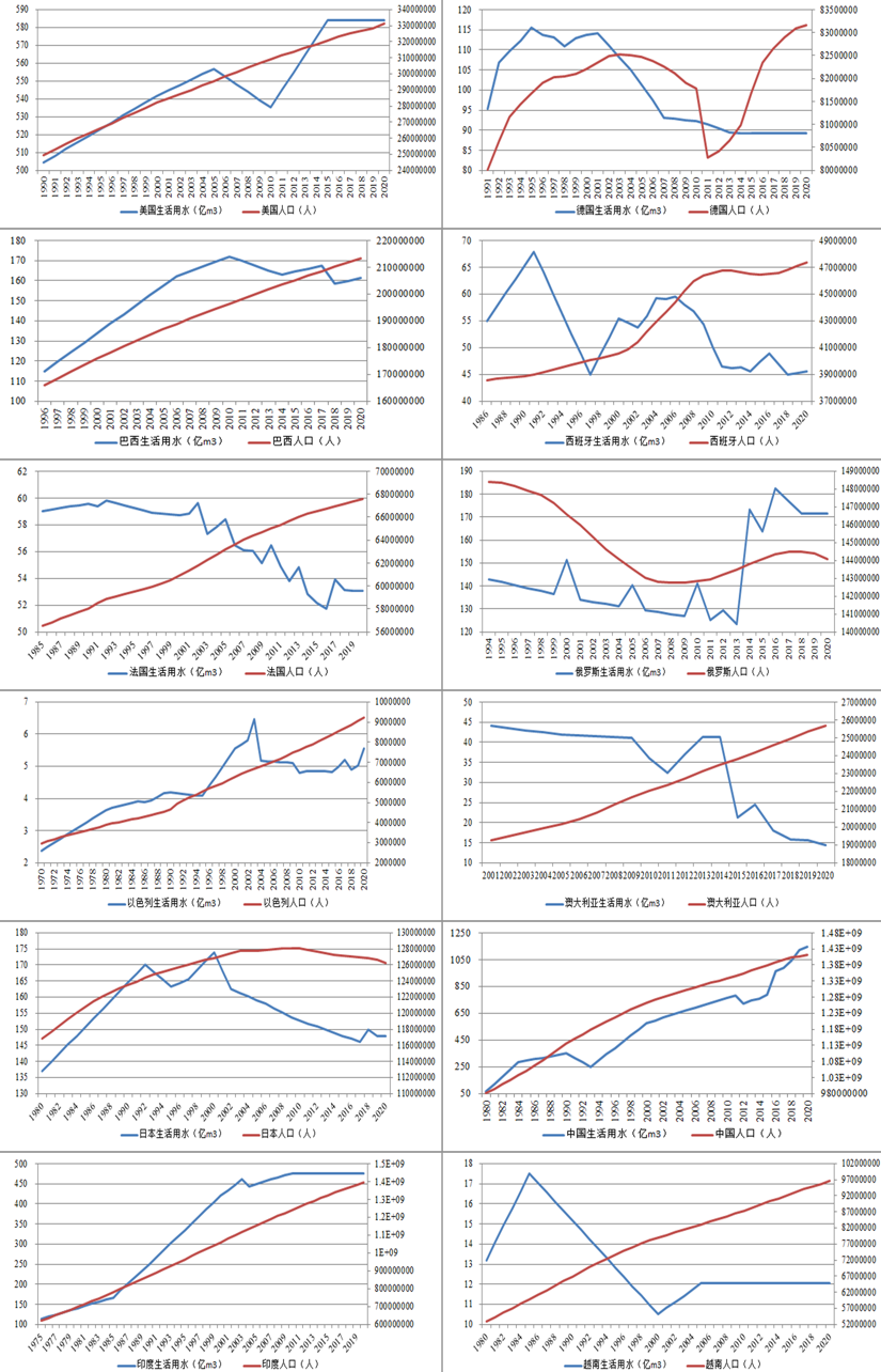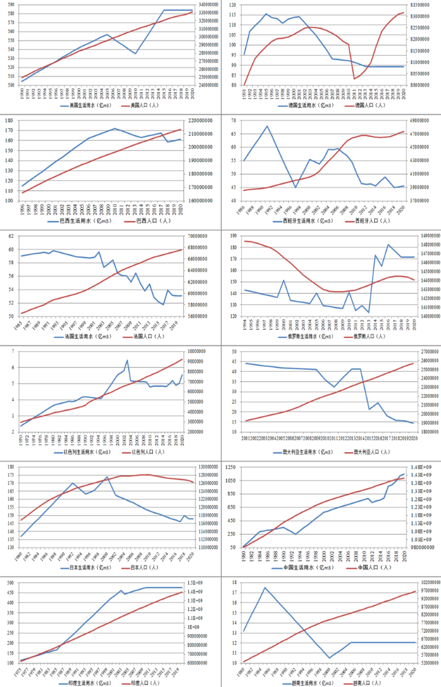 圖11 典型國(guó)家多年來(lái)生活用水與人口關(guān)系變化