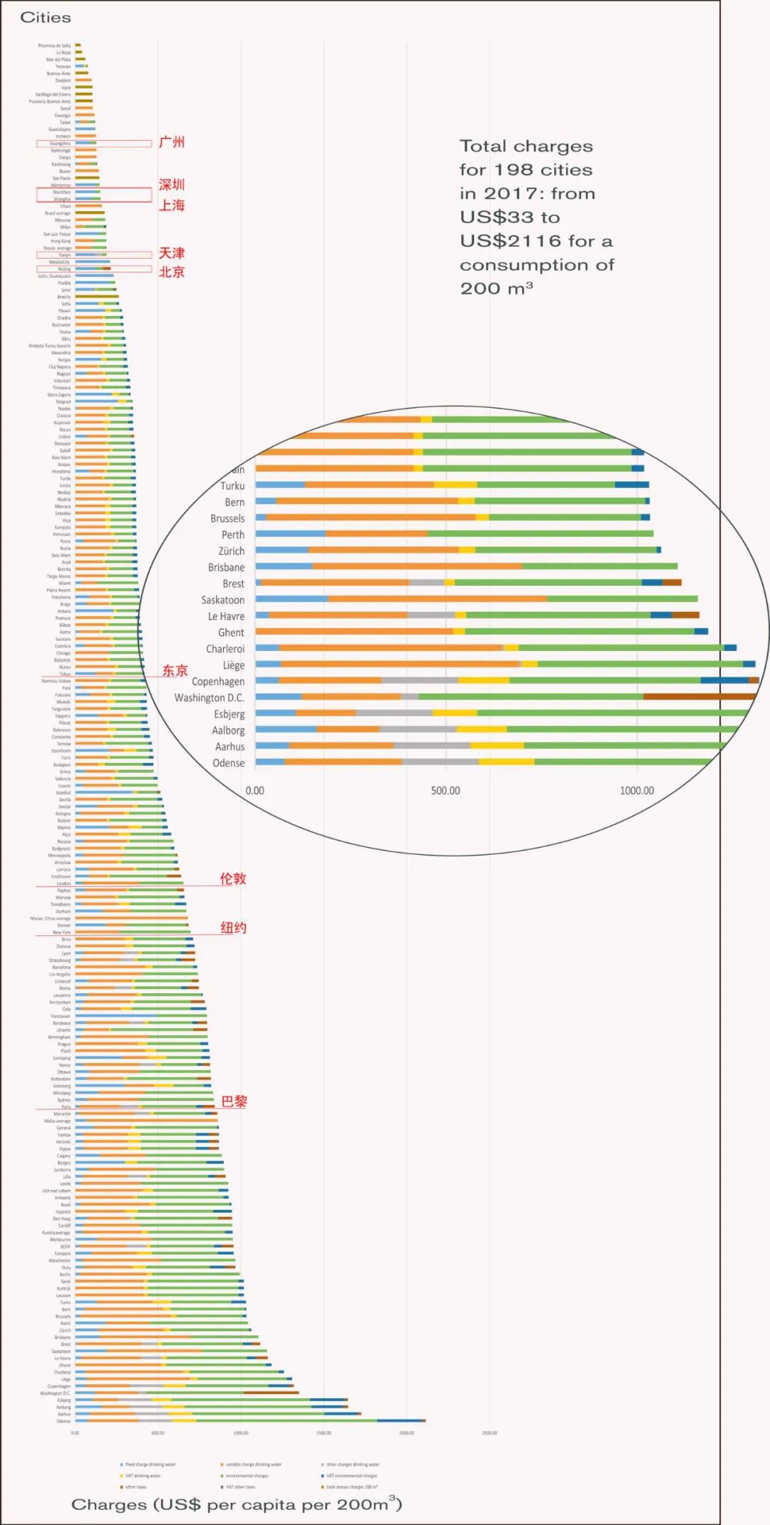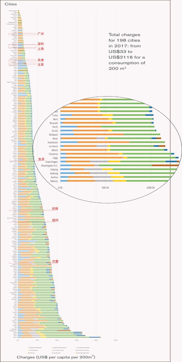 有研究提出,紐約、倫敦、東京、巴黎和新加坡家庭水費(fèi)支出占城市家庭收入的比例介于0.58%~1.10%,平均為0.76%,國(guó)內(nèi)典型城鎮(zhèn)介于0.24%~0.42%,國(guó)內(nèi)明顯低于國(guó)際。IWA Statistics and Economics組織編寫(xiě)了International Statistics for Water Services 2018并于去年10月的國(guó)際水協(xié)世界水大會(huì)上正式發(fā)布,總結(jié)了2017年39個(gè)國(guó)家198個(gè)城市水費(fèi)情況,見(jiàn)圖12。按水費(fèi)從小到大進(jìn)行排序,北京排在第33位(廣州、深圳、上海、天津排位更靠前)。選擇紐約、倫敦、東京、巴黎等國(guó)際典型城市與我國(guó)典型城市進(jìn)一步比對(duì),從水費(fèi)組成看,我國(guó)水價(jià)和排污費(fèi)均明顯偏低,見(jiàn)圖13。因此,從資源保護(hù)、環(huán)境治理、高質(zhì)量發(fā)展要求等方面看,我國(guó)水價(jià)調(diào)整勢(shì)在必行。農(nóng)業(yè)是用水大戶,加快推進(jìn)農(nóng)業(yè)水價(jià)綜合改革也是節(jié)水潛力所在。未來(lái)進(jìn)一步落實(shí)兩手發(fā)力,在價(jià)格杠桿調(diào)節(jié)供求后,提高用水效率、進(jìn)一步節(jié)水還有空間。