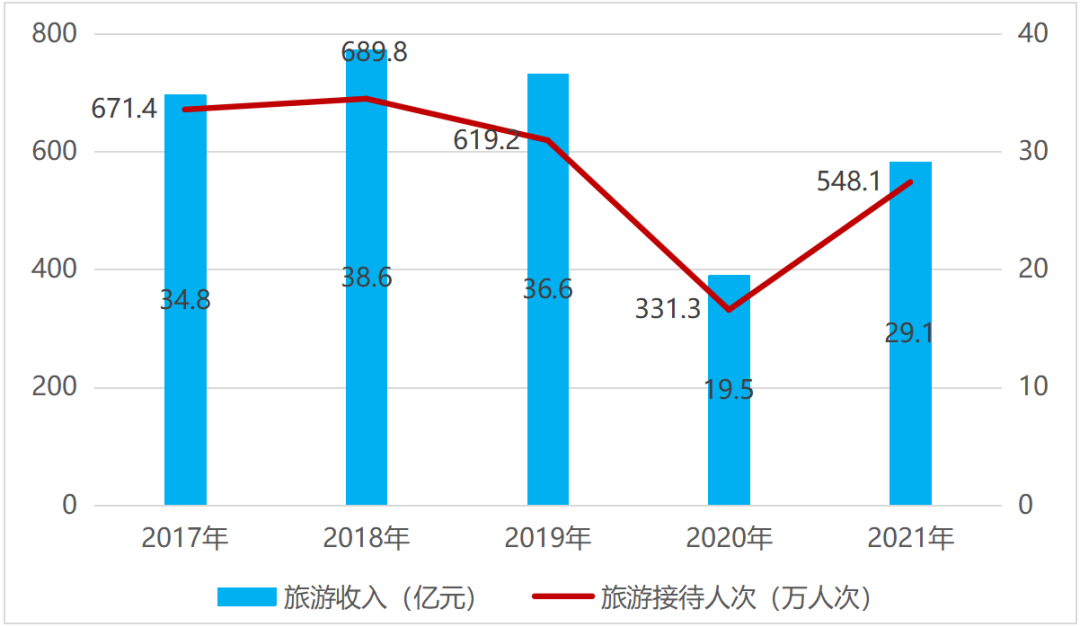 數(shù)據(jù)來源:2017年-2021年北京市分區(qū)旅游數(shù)據(jù)統(tǒng)計報告。圖3  2017年-2021年平谷區(qū)旅游收入及接待人次情況