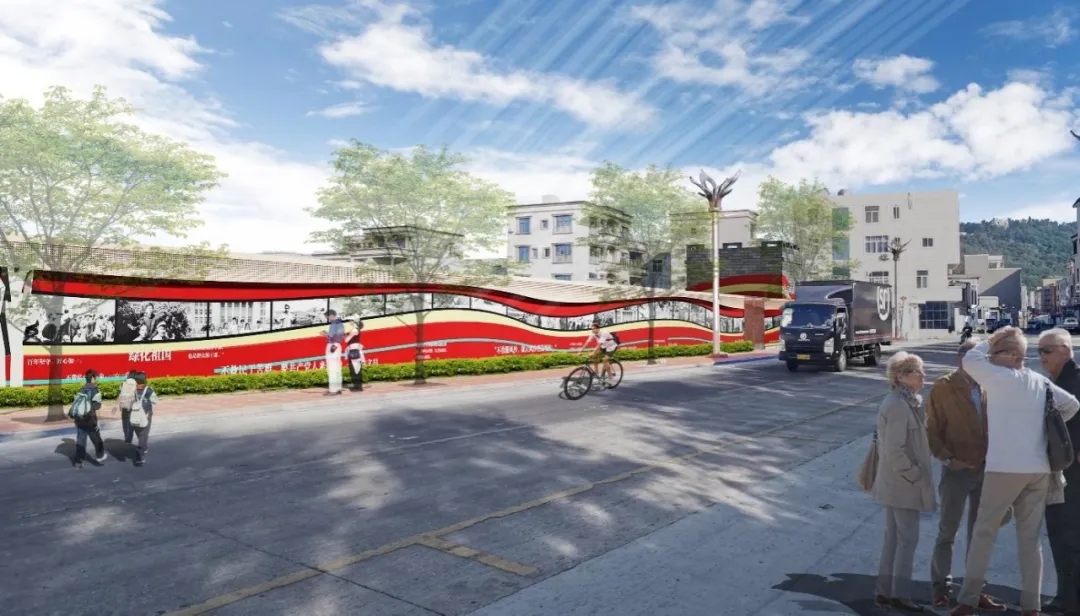 項(xiàng)目組通過(guò)調(diào)研發(fā)現(xiàn),主要居民點(diǎn)西北側(cè)主入口沿街兩側(cè)風(fēng)貌較差,于是,他們腦洞大開,通過(guò)給街道“老墻上新妝”,巧妙地將黨建文化建設(shè)與村容村貌提升工作相結(jié)合,突顯地方黨建特色。同時(shí)深入挖掘東山紅色文化,選取谷文昌同志在東山植樹造林防風(fēng)治沙的偉大事業(yè)與鄉(xiāng)村振興的實(shí)踐工作為題材,將澳角村地方黨建事跡、特色黨建文化融入黨建墻設(shè)計(jì),提升文化在地性;優(yōu)化行道樹及周邊綠地植物配置,為澳角村道路提升提供良好示范。
