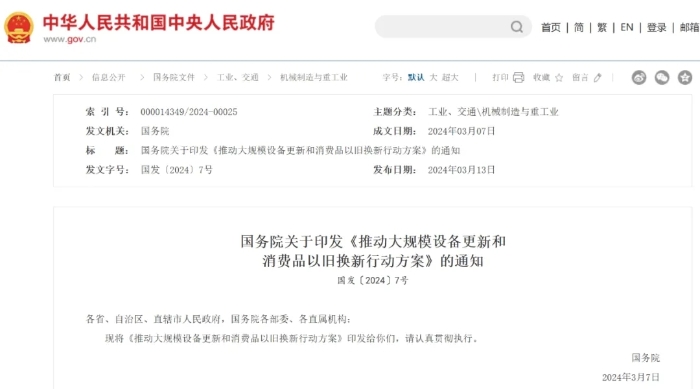近日,國務(wù)院印發(fā)《推動大規(guī)模設(shè)備更新和消費品以舊換新行動方案》(國發(fā)〔2024〕7號,以下簡稱7號文),重點實施設(shè)備更新、消費品“以舊換新”、回收循環(huán)利用、標(biāo)準(zhǔn)提升四大行動,并明確提出加大財政政策支持力度和優(yōu)化金融支持,為大規(guī)模設(shè)備更新和消費品“以舊換新”提供堅實有效的政策保障。