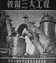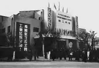 鞍山市中心人民劇院會(huì)場(chǎng),門前是象征建設(shè)“基礎(chǔ)”的4個(gè)巨大的紅色方柱子,上面矗立著象征偉大建設(shè)的灰色鋼架建筑物;用高爐和無(wú)縫鋼管、重軌圖案組成的“三大工程”竣工紀(jì)念章模型,在會(huì)場(chǎng)門前的墻上發(fā)出金色的光輝。主席臺(tái)的兩側(cè)掛著中國(guó)共產(chǎn)黨中央委員會(huì)和中央人民政府給大型軋鋼廠、無(wú)縫鋼管廠和7號(hào)高爐竣工典禮的紀(jì)念錦旗以及周恩來(lái)總理給大會(huì)的題詞。