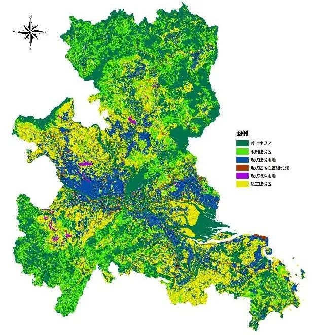 分析得出中心城區(qū)禁建區(qū)總面積約1399平方公里,占陸域面積的53.86%,主要位于薌城區(qū)西部、龍文區(qū)東部、長泰區(qū)北部山區(qū)、龍海區(qū)南部山區(qū)及九龍江入海口地區(qū)。限制建設(shè)區(qū)總面積約573平方公里,占市轄區(qū)陸域面積的22.06%,主要位于丘陵地區(qū)及水域沿線。適宜建設(shè)區(qū)總面積約625平方公里,占市轄區(qū)陸域面積的24.08%,主要位于薌城區(qū)、龍文區(qū)、長泰區(qū)南部以及龍海區(qū)東部濱海地區(qū)。詳見圖2。