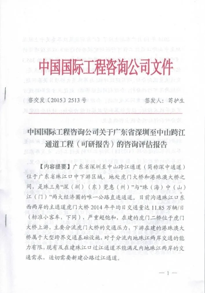 2015年11月,經(jīng)過(guò)評(píng)估組研究并進(jìn)行再次評(píng)估后,中咨公司關(guān)于廣東省深圳至中山跨江通道工程(可研報(bào)告)的咨詢?cè)u(píng)估報(bào)告正式提交國(guó)家發(fā)展改革委。